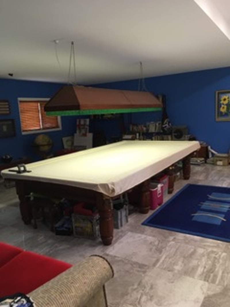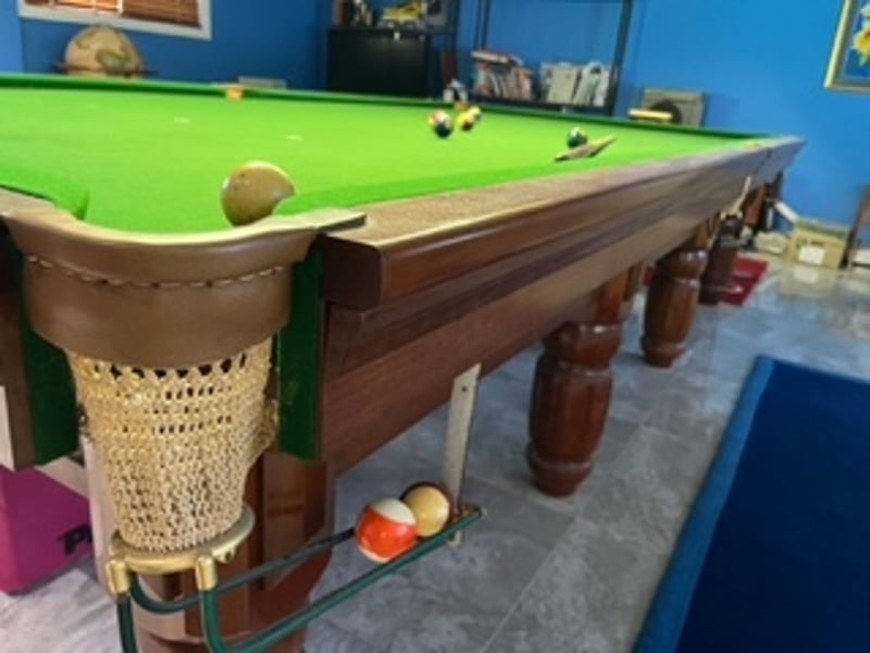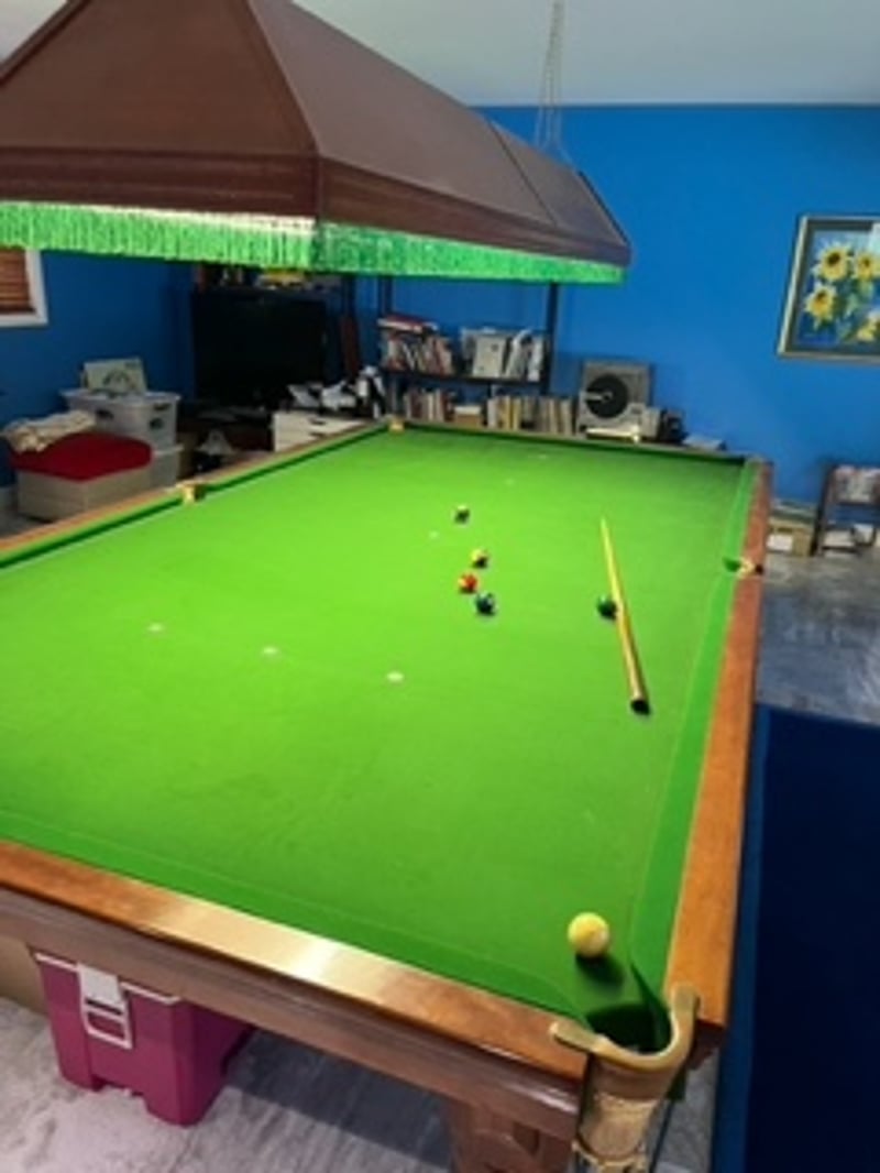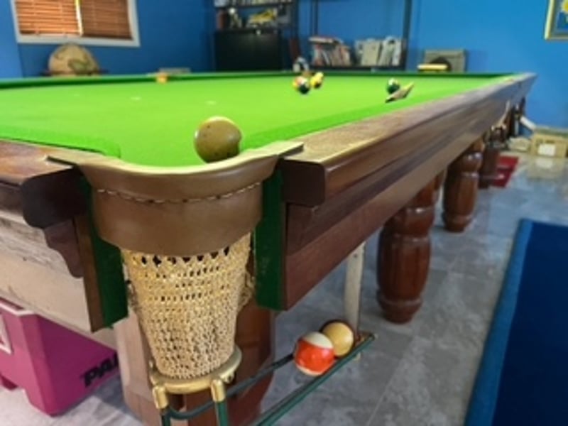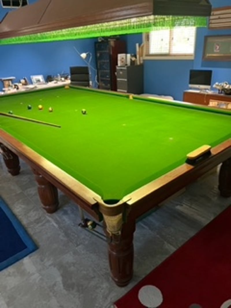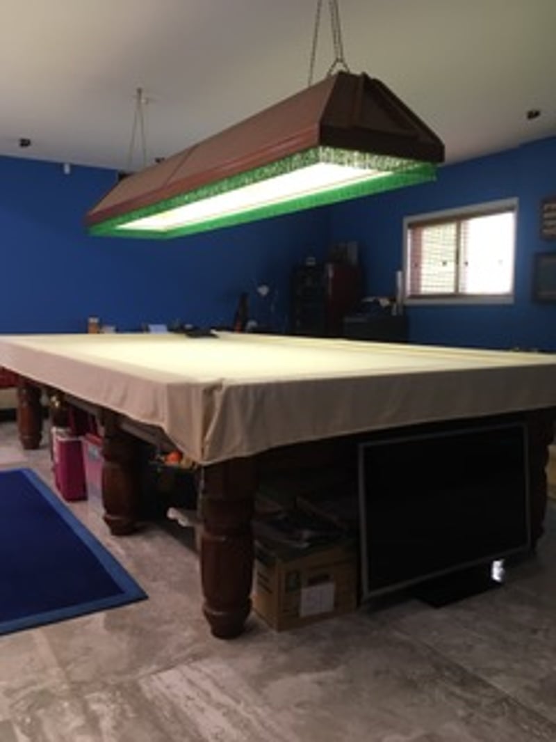 Commonwealth/Empire standard Snooker or Billiard Table 12’ x 6’ Approximately 60 years old, comprises the table itself, two sets - one each of snooker and billiard balls, roller score-rack, cues and wall rack for cues, long and short spiders and jiggers (4), timber and glass framed rules, overhead fringed light (240v), Calico cover with tasselled corners, triangle, brush and cue chalks Table has been professionally disassembled, parts bubble wrapped and stored ready for new owner The table itself comprises 5 massively heavy slate sections and several very large timber components with heavy solid legs LOCATION: Brisbane, QLD Note: Item is held in secure storage and is not available for inspection