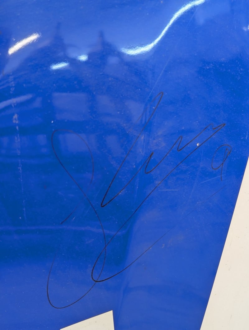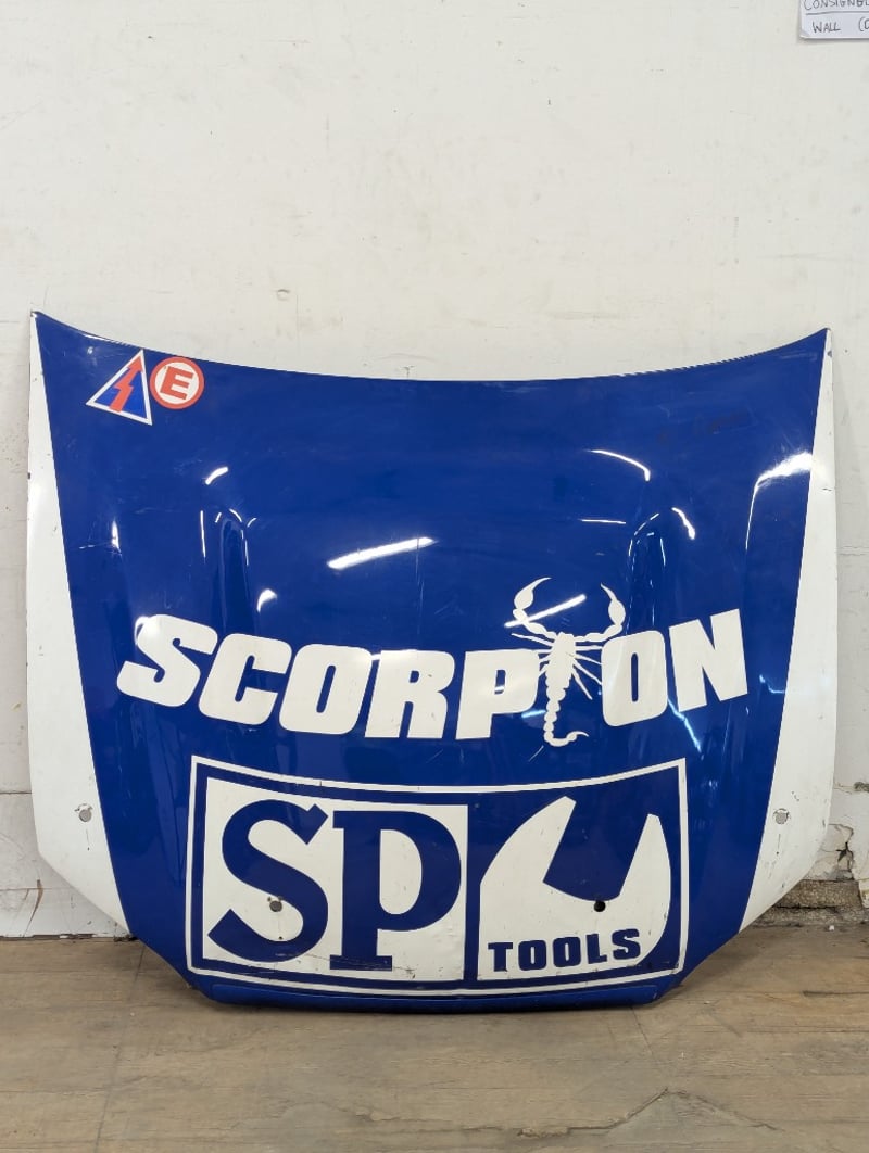 HAND SIGNED V8 SUPERCAR SCORPION/SP TOOLS BONNET Item Size: Height: 126cm, Width: 152cm, Depth: 10cm Signature Unknown Dents And Scratches On Bonnet Condition: Fair - Refer To Images 587714+3