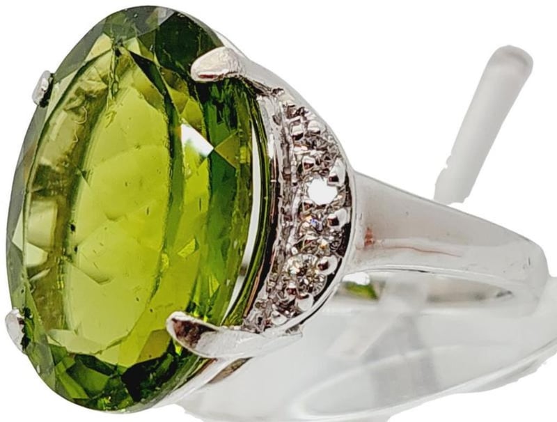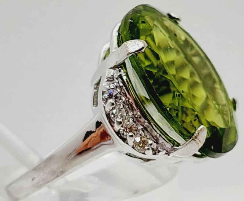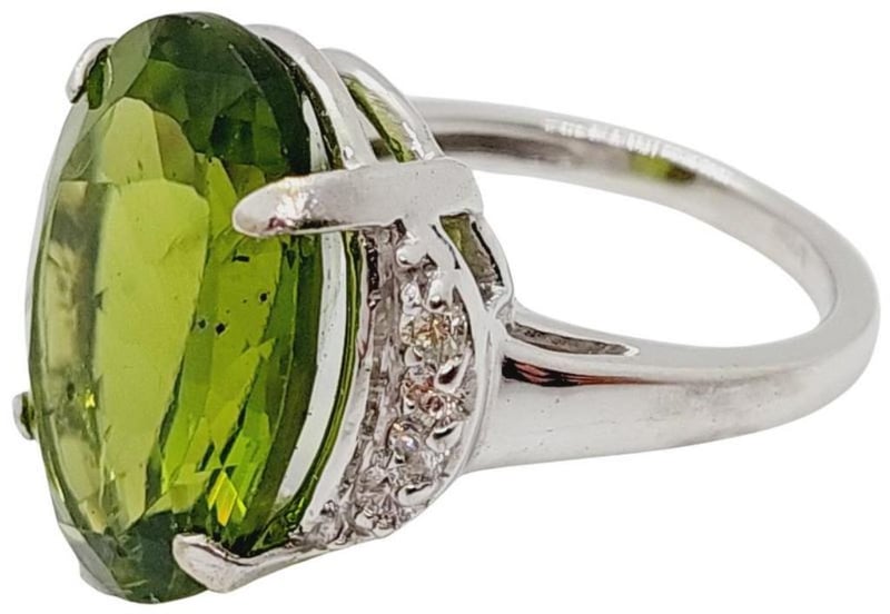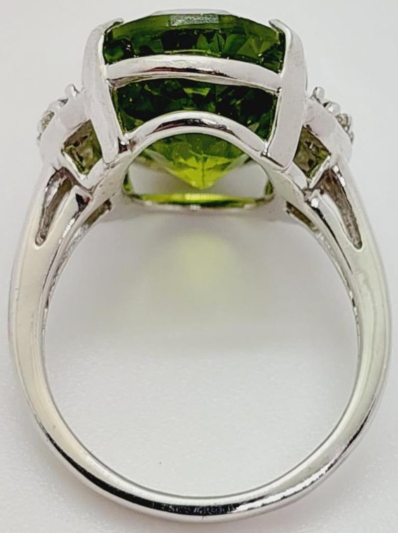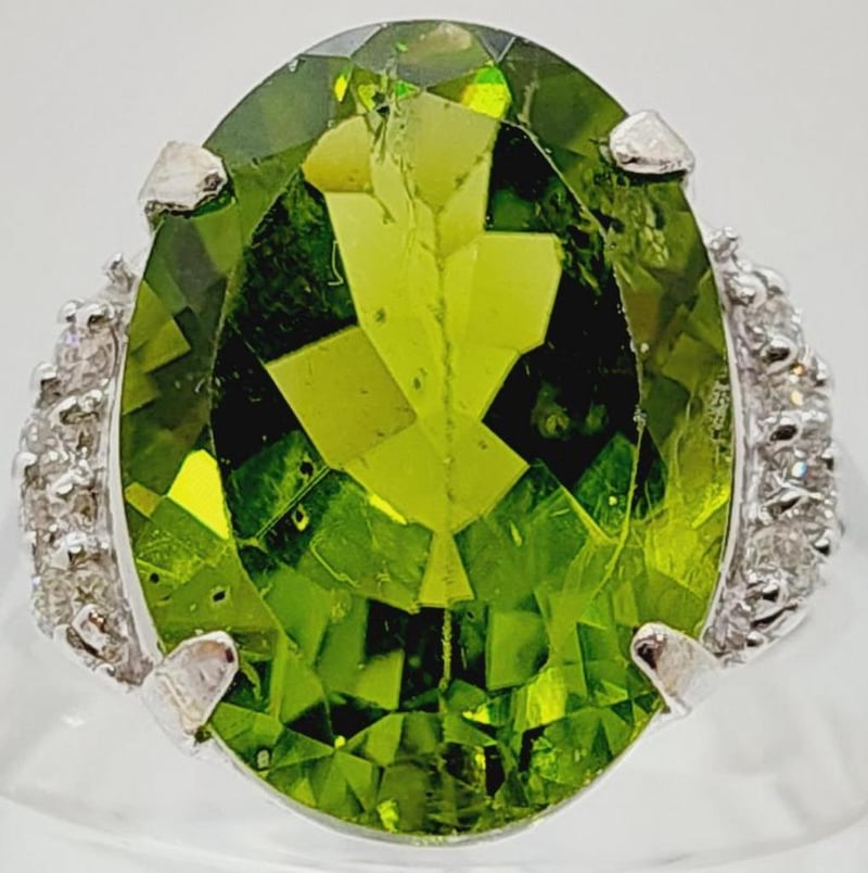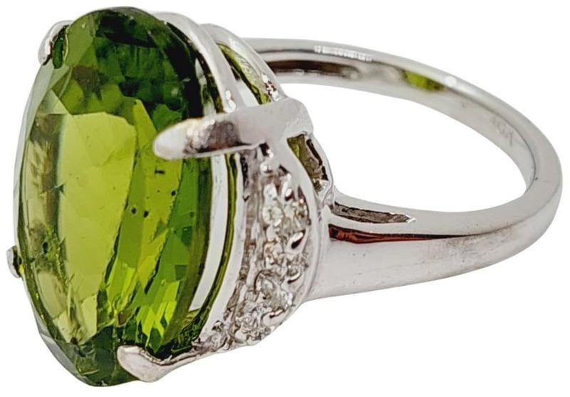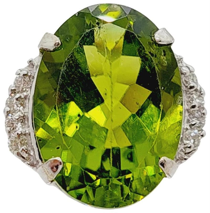 This 18 Carat White Gold Ring Features A 11.80Ct Claw Set Oval Cut Peridot, Measuring 17.3Mm X 12.5Mm X 7.5Mm And Deep Green In Colour With 8 Claw Round Brilliant Cut Diamonds Claw Set On Either Side Of The Centre Stone, 0.16Ct In Combined Weight, Si In Clarity And G In Colour.