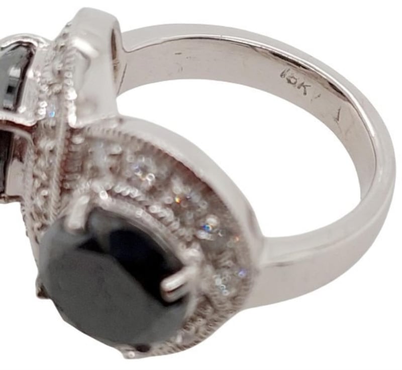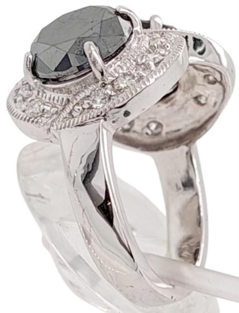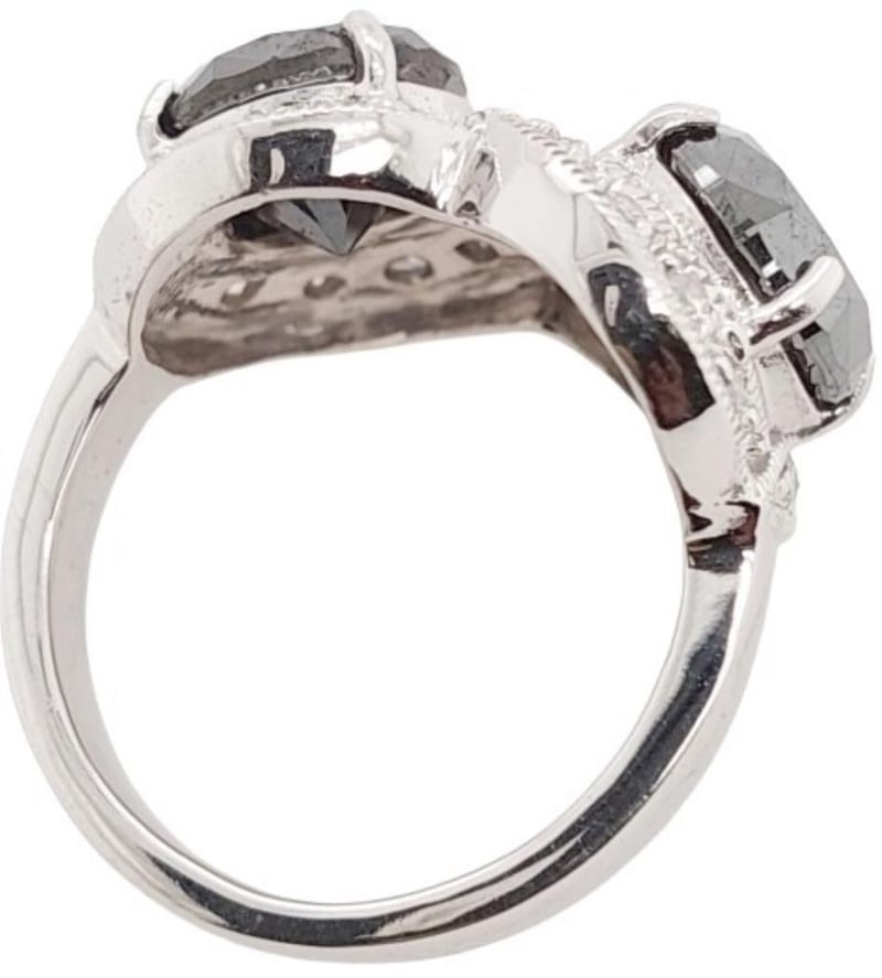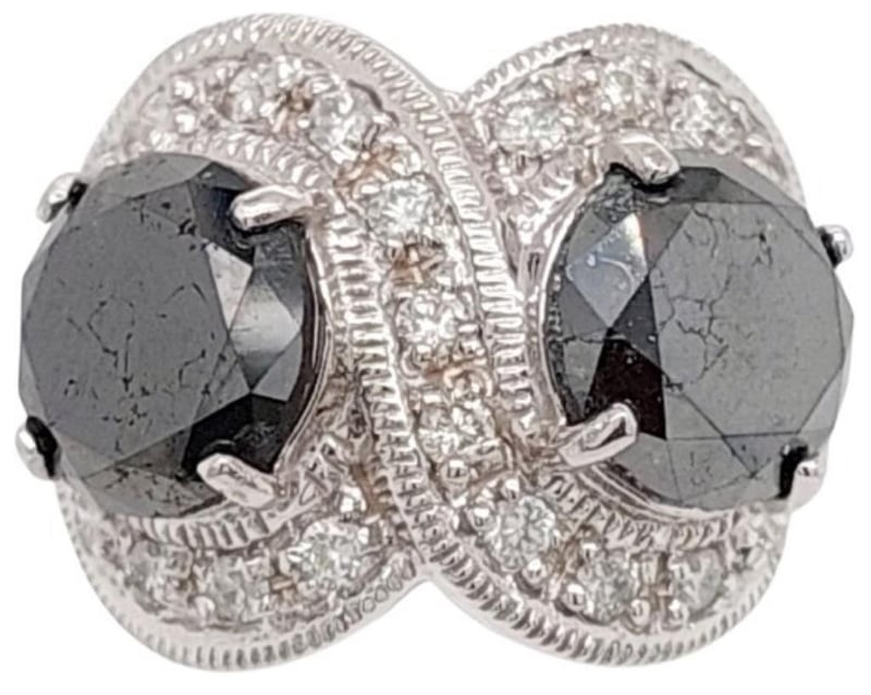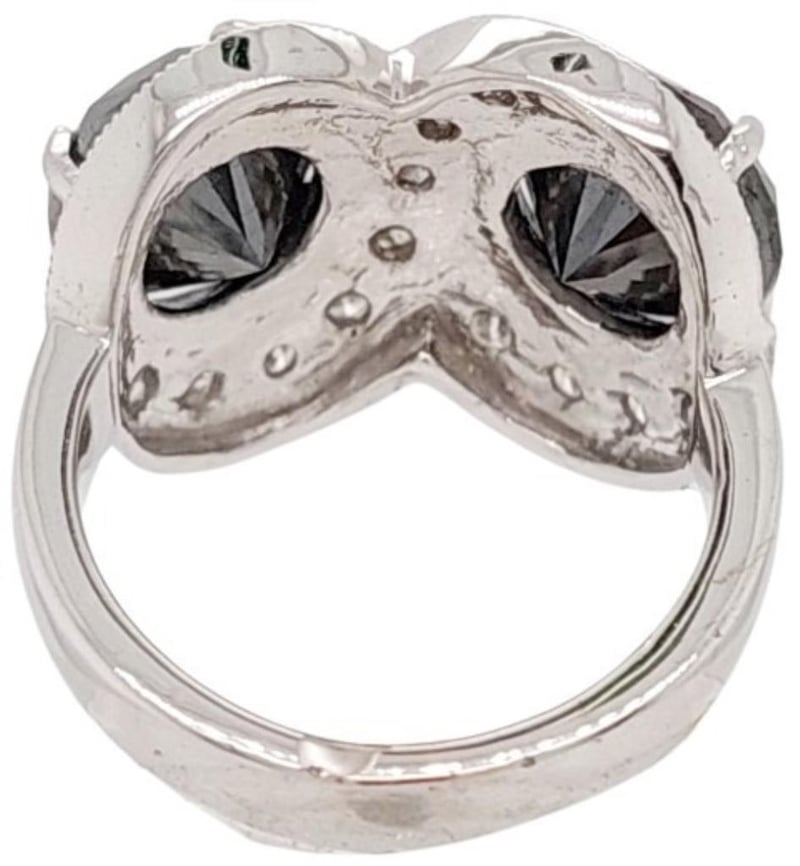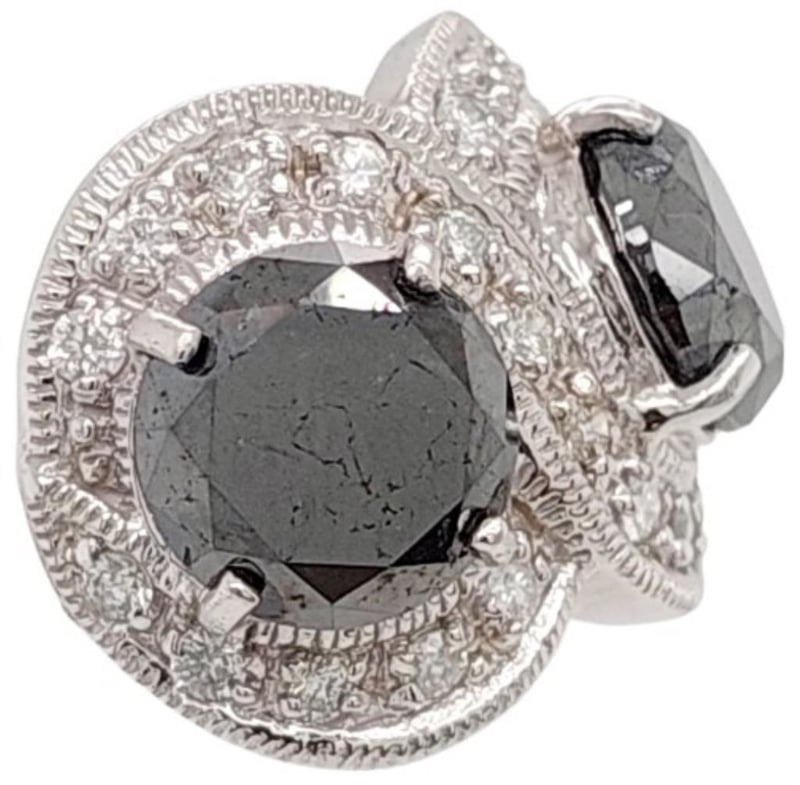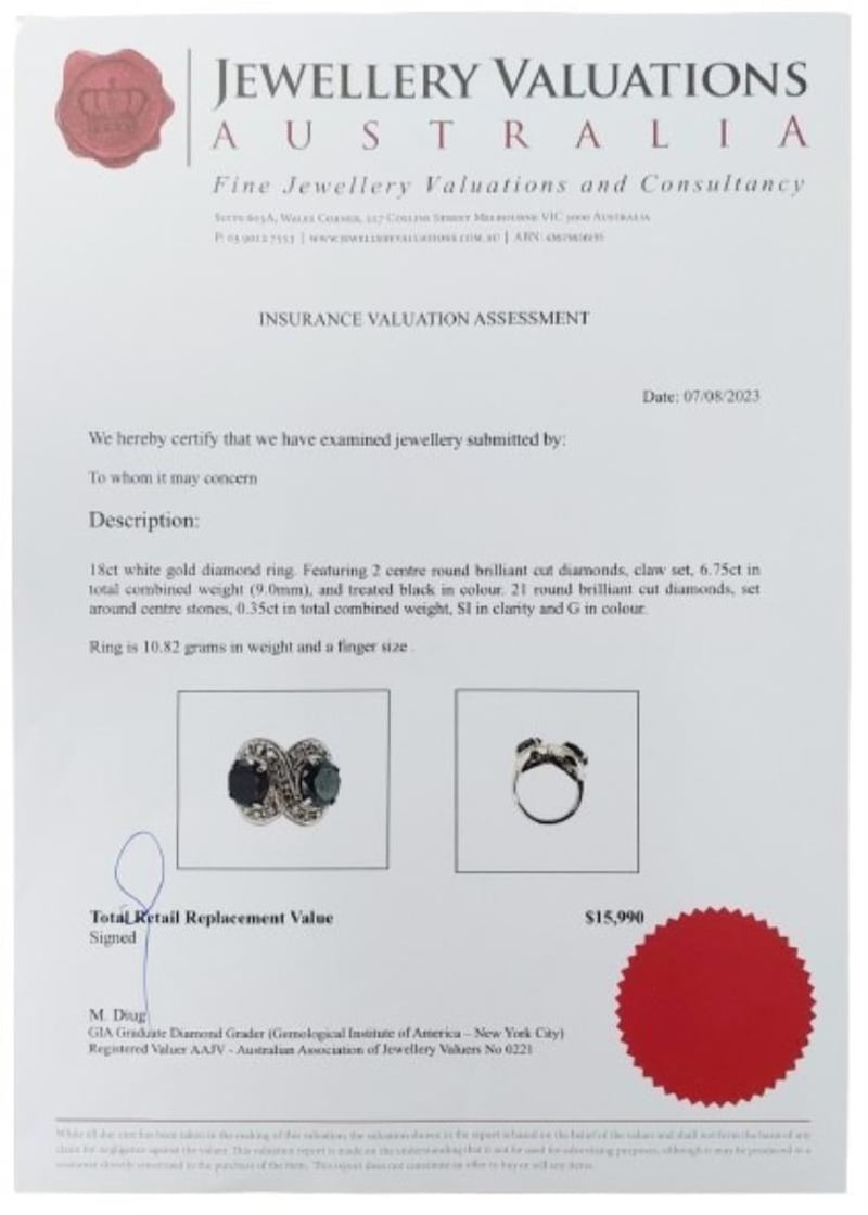 This 18Ct White Gold Diamond Ring Features 2 Brilliant Round Cut Centre Diamonds In Claw Set 6.75Ct In Total Combined Weight And Treated Black In Colour. The Ring Also Features 21 Brilliant Round Cut Diamonds Set Around The Centre Stone 0.35Ct In Total Combined Weight Si In Clarity And G In Colour.