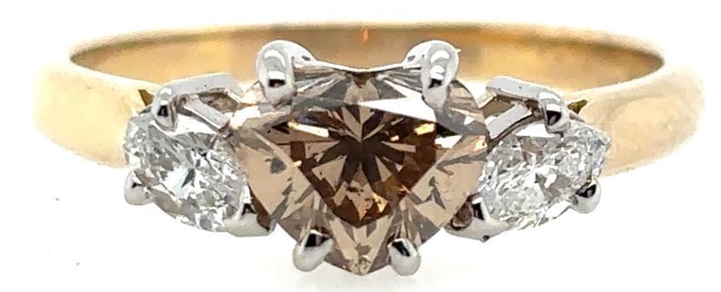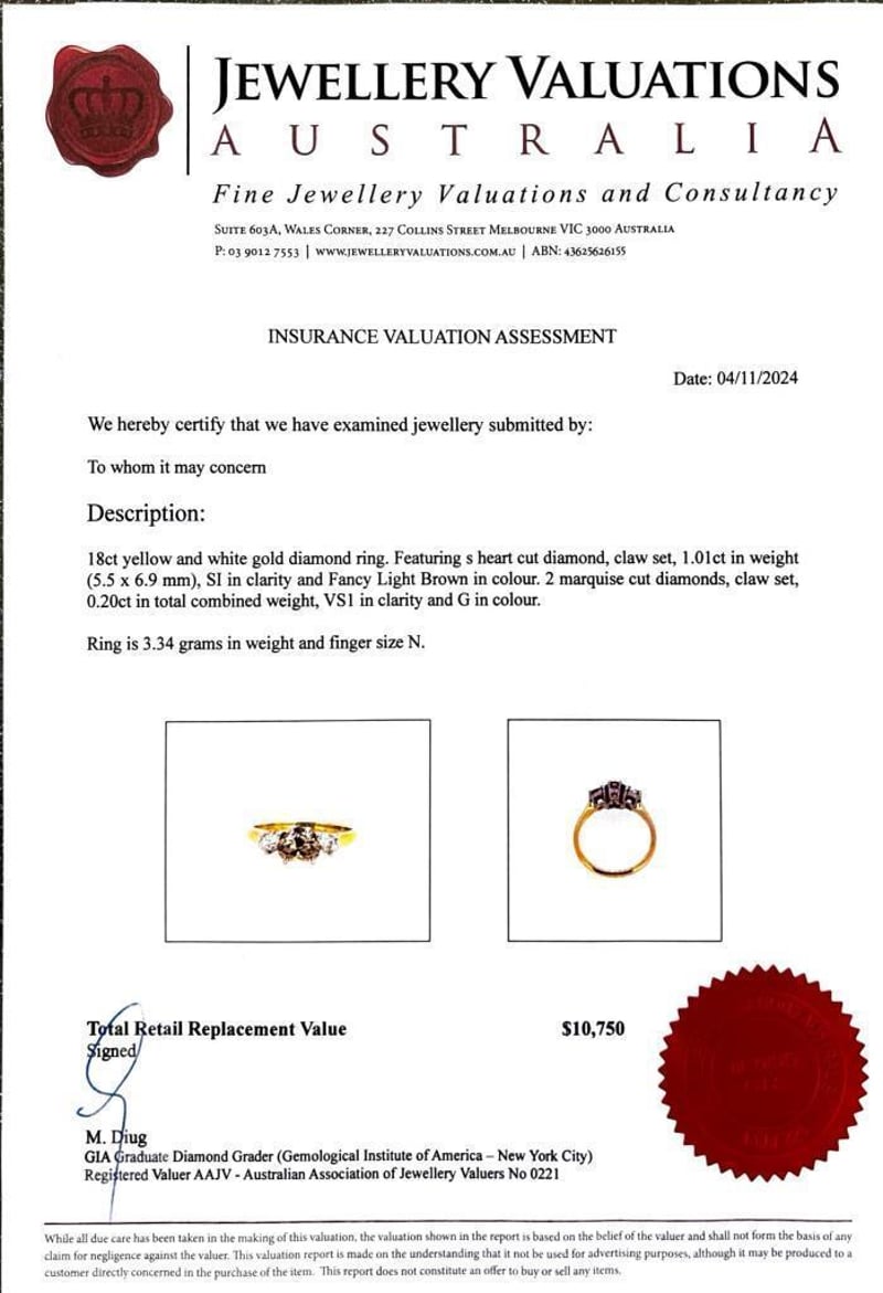 This 18Ct Yellow & White Gold Ring Features 1 X Approx. 1.01Ct Heart Cut Claw Set Diamond Measuring 5.5 X 6.9Mm, Clarity: Si, Colour: Fancy Light Brown. This Ring Also Features 2 X Marquise Cut Claw Set Diamonds, Tcw: 0.20, Clarity: Vs1, Colour: G.