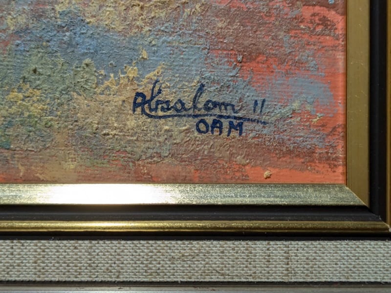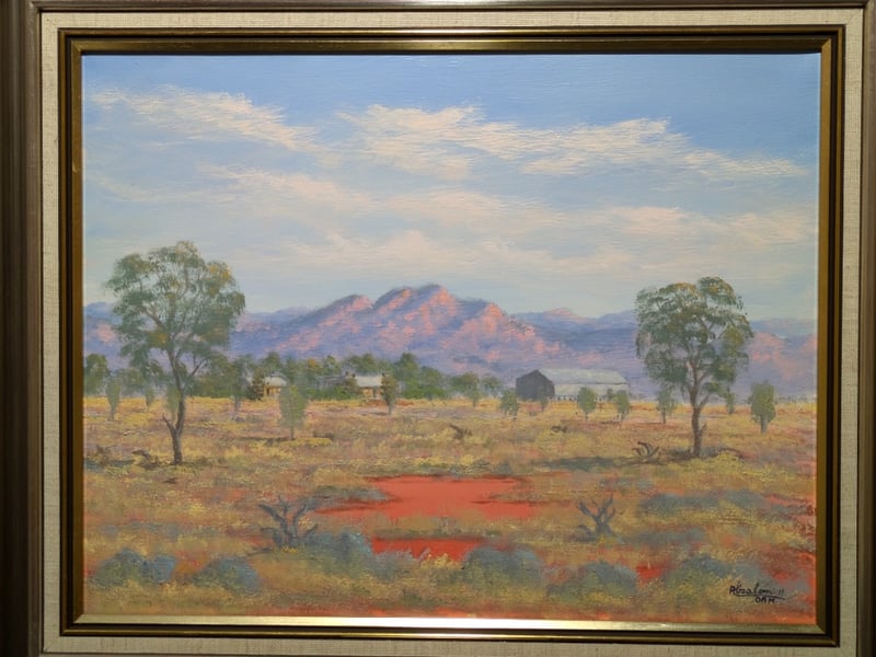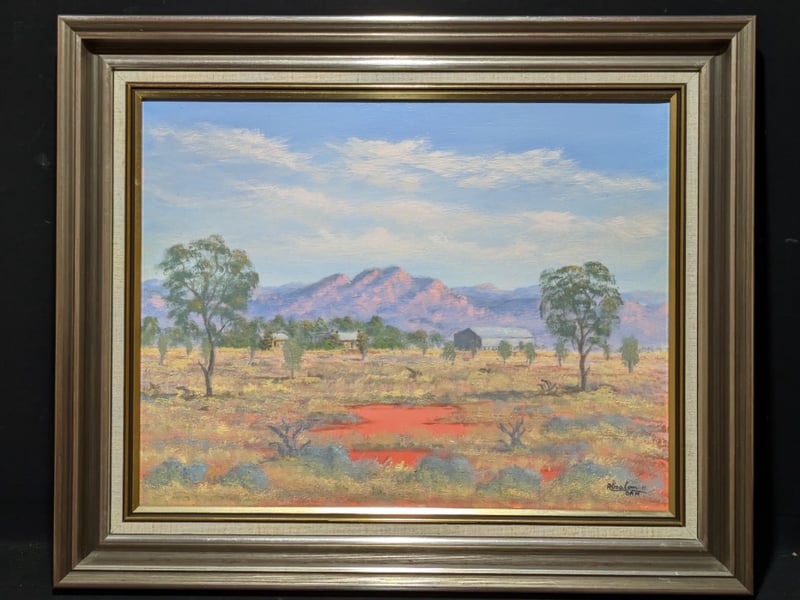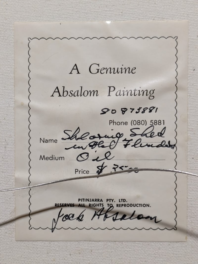 JACK ABSALOM OAM (1927-2019) Original Oil Painting On Canvas Title: Shearing Shed Central Flinders Image Size: 34.5cm x 44.5cm Item Size: Height: 48cm, Width: 58cm, Depth: 4cm Signature Details: Signed Absalom Oam In The Lower Right Corner Condition: Fair - Refer To Images Provenance: Certificate On Rear Of Painting Issues By Pitinjarra Pty. Ltd. Ref#80875891 Sr 233442+6
