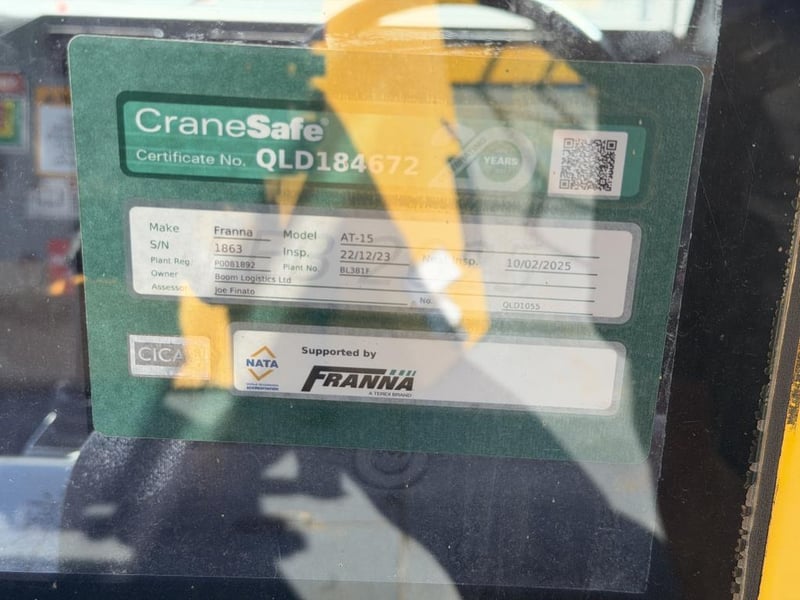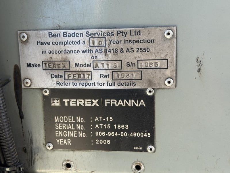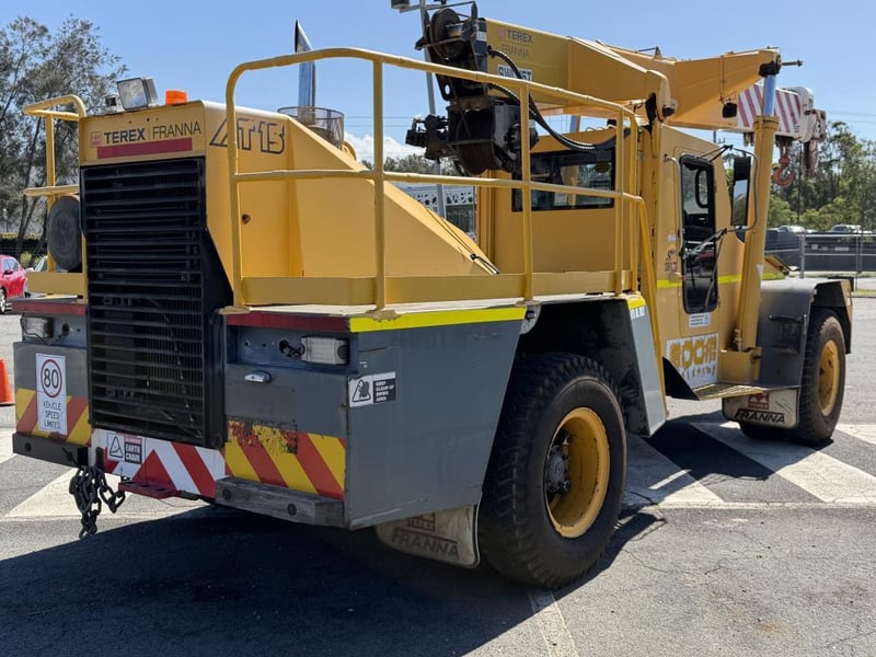 2014 Franna AT-15 Crane Truck Year: 2014 Make: Franna Model: AT-15 Configuration: 8x2 Odometer Indicated: 61,022 kms Hours Indicated: 11,862 Engine: I6 Diesel Transmission: Automatic VIN: AT15 1863 Engine Number: 906-964-00-490045 Colour: Yellow Seats: 2 SOLD UNREGISTERED Key# M43 Carrara