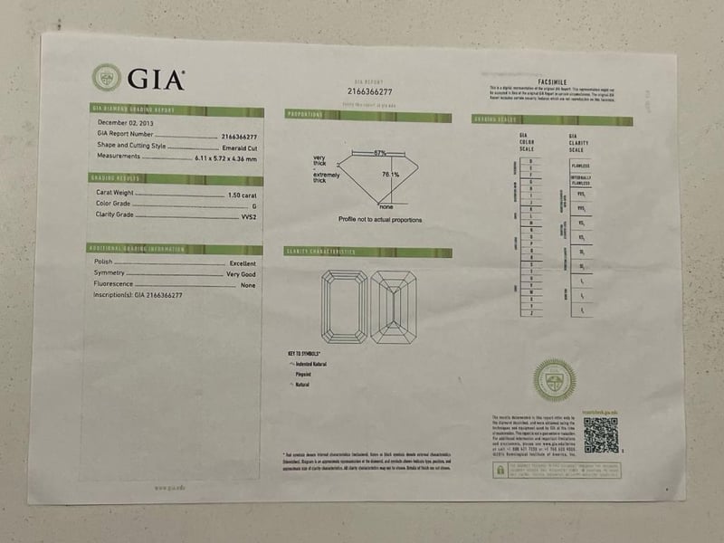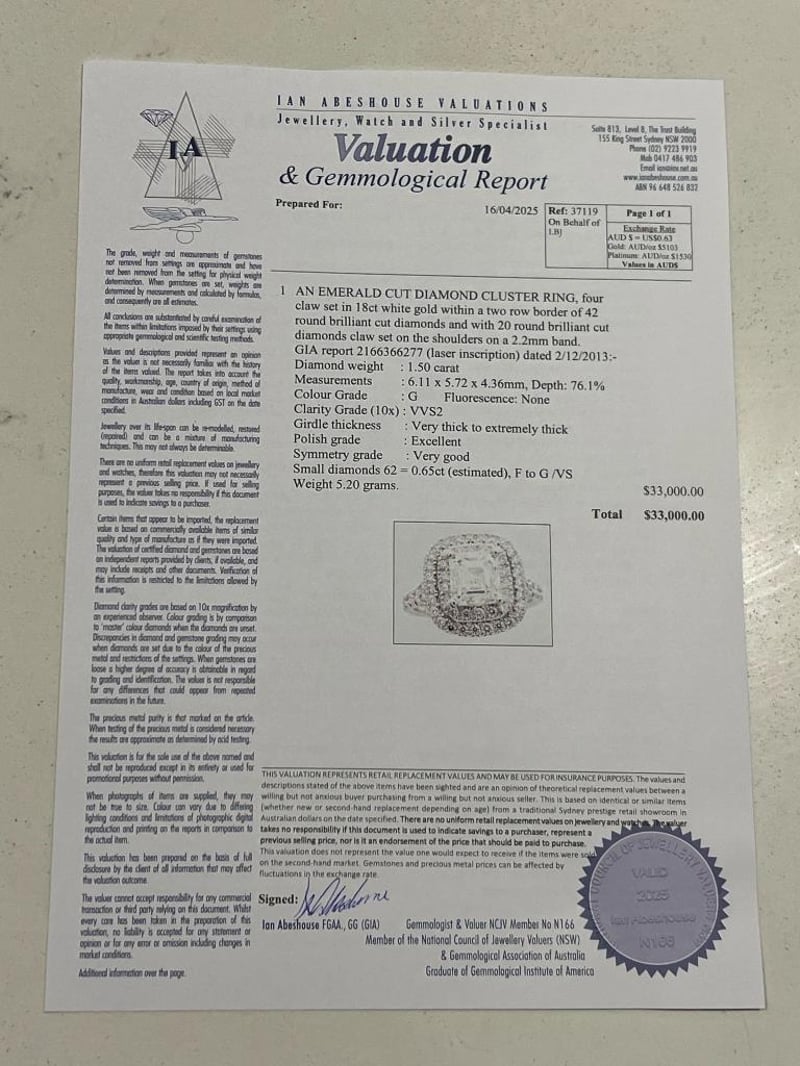 GIA 18CT WHITE GOLD EMERALD CUT DIAMOND HALO RING 2.15CT 5.20G This Exceptional Gia Certified Emerald Cut Diamond Cluster Ring Is Masterfully Crafted In 18Ct White Gold, Showcasing A Breathtaking 1.50Ct Emerald Cut Diamond, Four-Claw Set And Framed By A Double Halo Of 42 Round Brilliant-Cut Diamonds. The Shoulders Are Set With An Additional 20 Round Brilliant-Cut Diamonds, Adding Brilliance And Symmetry Along The 2.2Mm Band.The Centre Stone Is Gia-Certified, Graded G Colour And Vvs2 Clarity, With Excellent Polish And Very Good Symmetry, And Shows No Fluorescence. The Total Estimated Weight Of The Small Diamonds Is 0.65Ct, Graded F–G Colour And Vs Clarity, Bringing The Total Diamond Weight To 2.15Ct. The Ring Weighs 5.20 Grams, Ring Size J.Accompanied By Gia Report Number 2166366277 Dated 02/12/2013 And Valuation Report Number 37119 Dated 16/04/2025.Free Express International Delivery For Orders Over $1000 Aud. Free Express Delivery With Insurance Australia Wide. Rrp $33,000. Complimentary Resizing For This Ring Available. Valuations Provided by an Independent Third-Party Professional Not Directly Associated With Lloyds Auctions at AUD $33000This valuation has been conducted by an independent third-party professional. The valuation amount is an assessment by the issuing valuer and does not reflect the auction value of the item. Any inquiries regarding the valuation should be directed to the issuing valuer (refer to contact details on the certificate), as Lloyds Auctions has no affiliation or influence over the valuation, the valuer, or the stated amount. Condition: Good - Refer Images 0488403+24