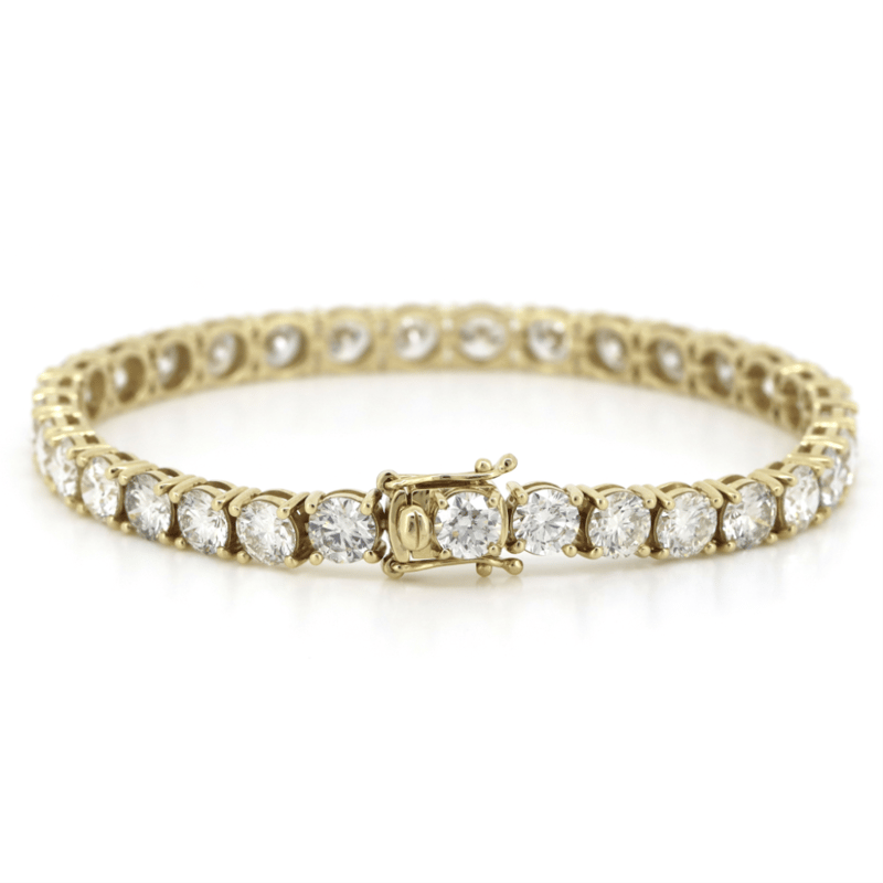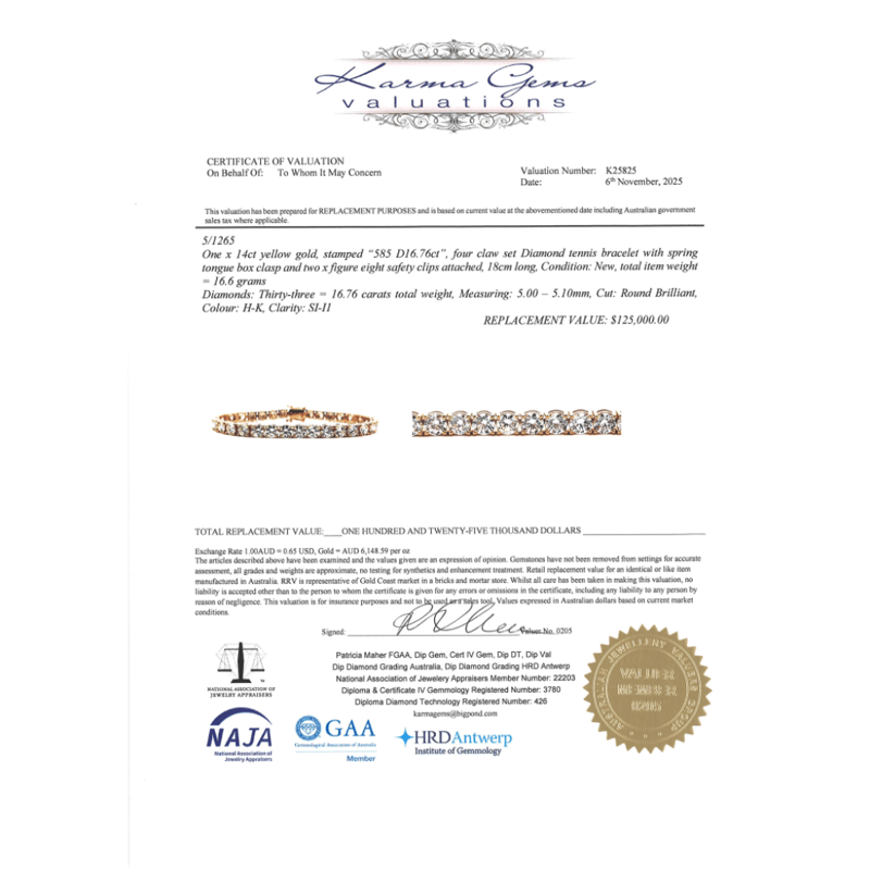 14K YELLOW GOLD, 16.76CT TDW DIAMOND, TENNIS BRACELET. The Design Features, 33 Round Brilliant Cut, Diamonds (16.76Ct Tdw, H-K Colour, Si-I1 Clarity), 4 Claw Set In A Single Row. The Bracelet Has A Box Lock With 2 'Figure Eight' Safety Catches. Bracelet Length Is 18Cm. Valuations Provided by an Independent Third-Party Professional Not Directly Associated With Lloyds Auctions at AUD $$125,000.00This valuation has been conducted by an independent third-party professional. The valuation amount is an assessment by the issuing valuer and does not reflect the auction value of the item. Any inquiries regarding the valuation should be directed to the issuing valuer (refer to contact details on the certificate), as Lloyds Auctions has no affiliation or influence over the valuation, the valuer, or the stated amount. Condition: Good - Refer Images 0645887+5026