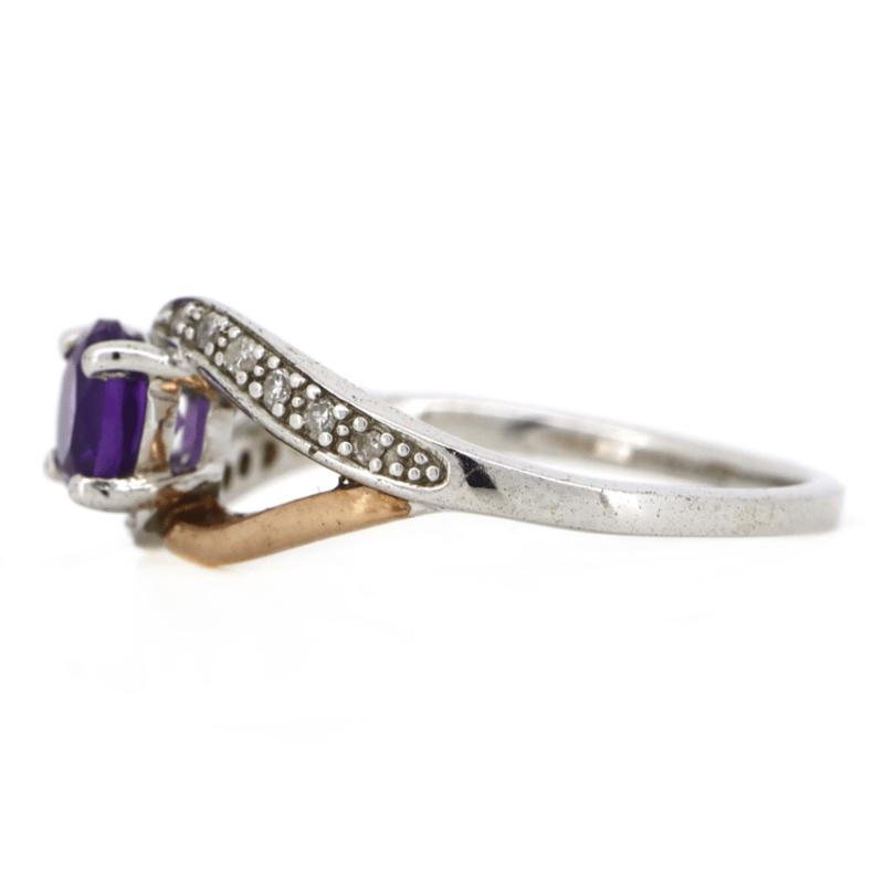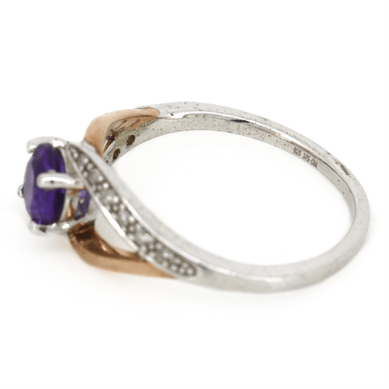 9K ROSE GOLD/ STERLING SILVER, AMETHYST AND DIAMOND, DRESS RING.