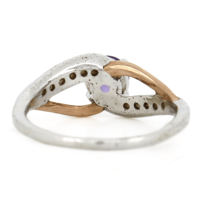 The Centre Features One Round Faceted Cut, Purple, Amethyst (0.40Ct, Eye Clean Clarity), 4 Claw Set. Decorating The Split Band Are 12 Round Single Cut, Diamonds (0.06Ct Tdw, H-J, Si-P1), Bead Set. Ring Size K.