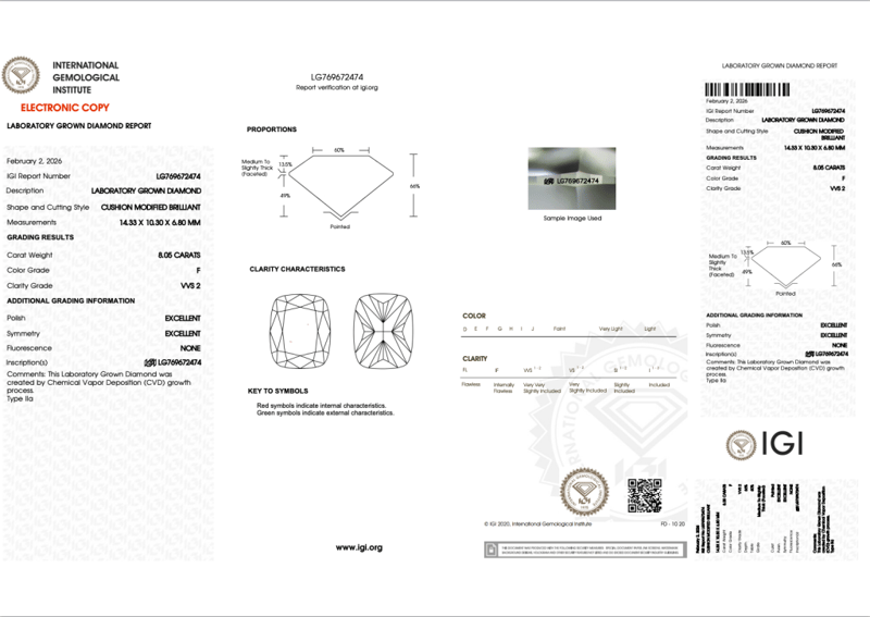 LAB GROWN DIAMOND CUSHION 8.05CT F VVS2 Dimensions: 14.33 x 10.30 x 6.80mms Accompanied By Igi & Inscripted Report Number Igi - 769672474 Condition: Good - Refer Images 0163087+7CROSS DOCK