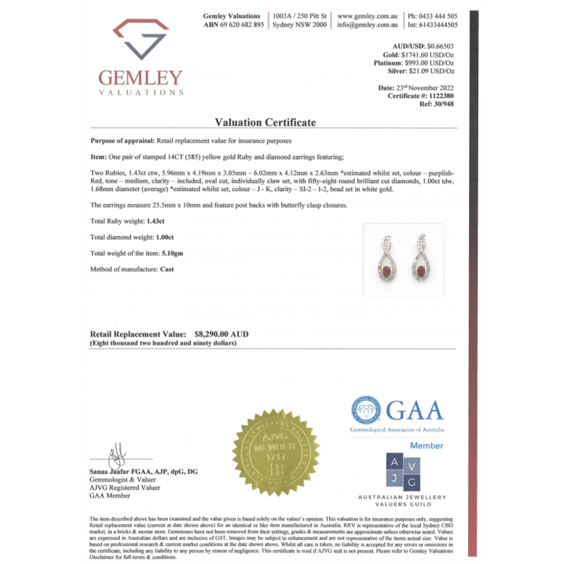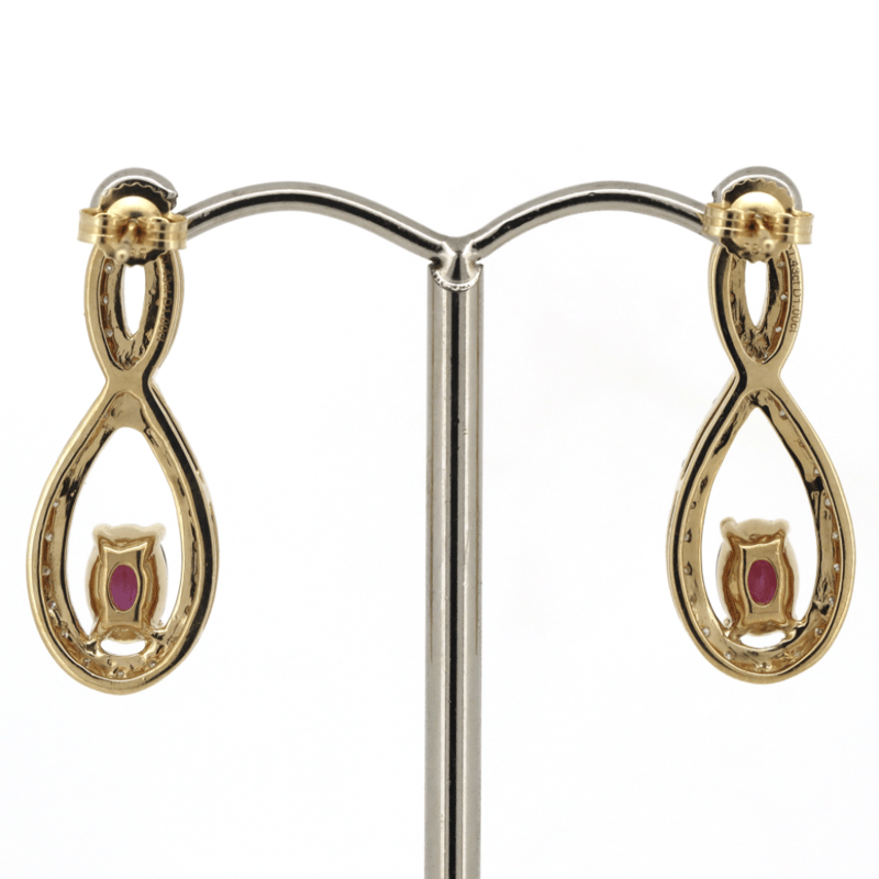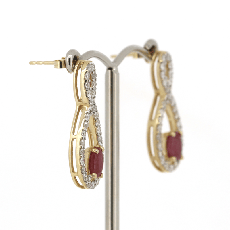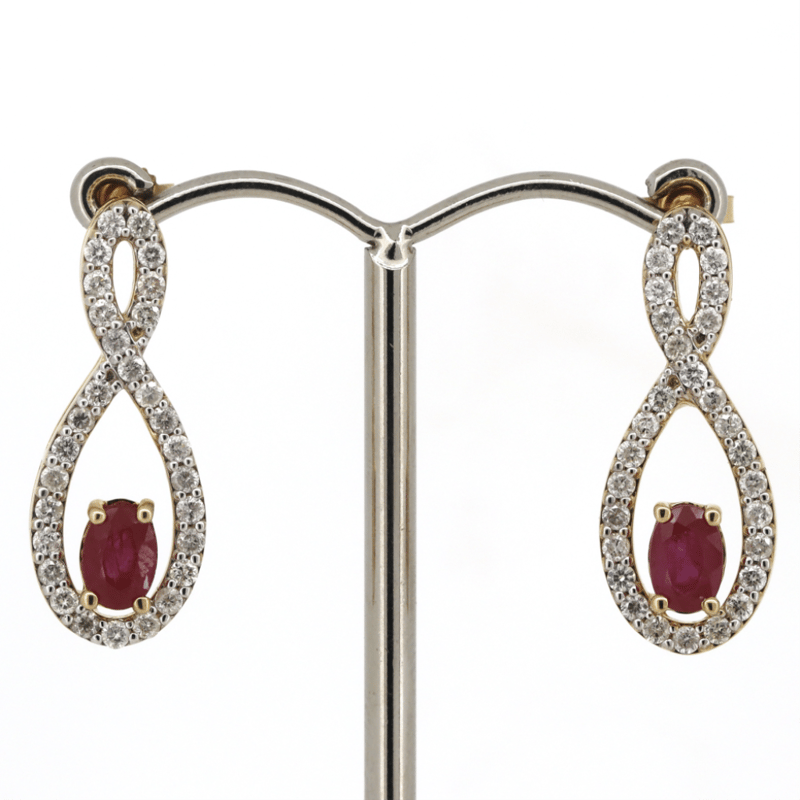 The Drops Feature, 2 Oval Cut, Medium Purplish-Red, Rubies (1.43Ct Tsw, Included), Claw Set. Decorating The Infinity Style Drops Are, 58 Round Brilliant Cut, Diamonds (1.00Ct Tdw, J-K Colour, Si2-I2 Clarity), Bead Set In White Gold. The Earrings Have Post Backs, With 14K Yellow Gold Butterfly Claps.