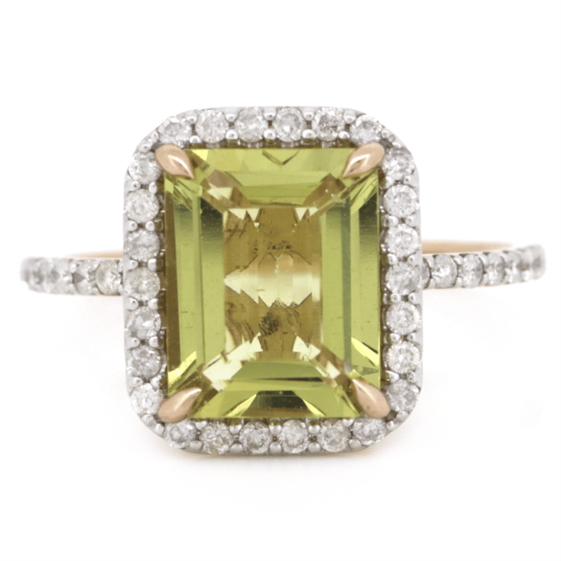 The Centre Features, One Emerald Cut, Greenish-Yellow, Heliodor (2.69Ct, Minor Eye Visible Inclusions), 4 Claw Set. Surrounding The Centre In A Halo And Decorating The Band Are, 44 Round Brilliant Cut, Diamonds (0.39Ct Tdw, J-K Colour, Si2-I2 Clarity), Bead Set In White Gold. Ring Size O.