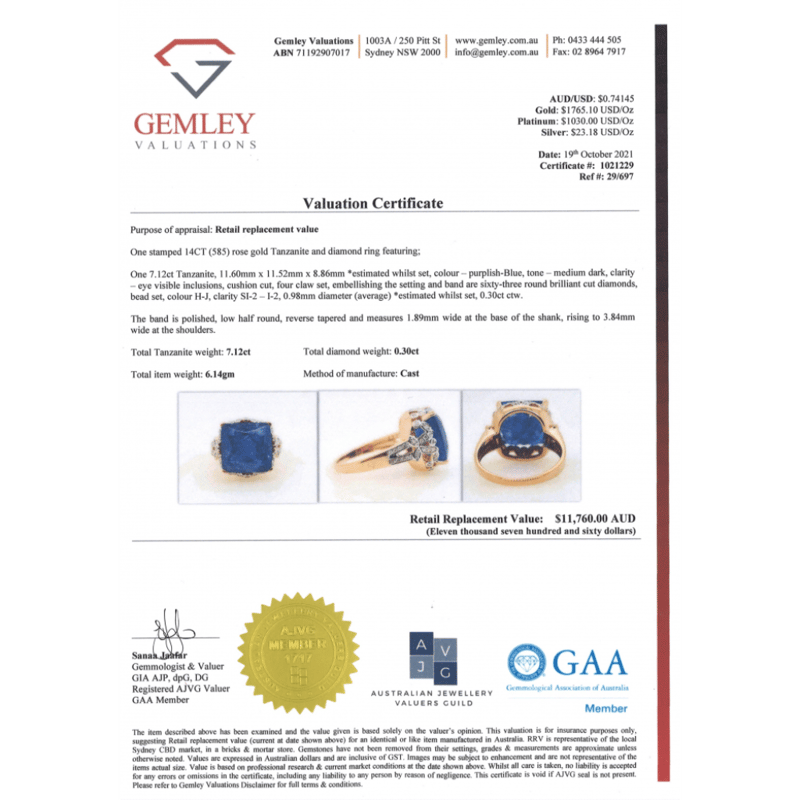The Centre Features, One Cushion Cut, Purplish-Blue, Tanzanite (7.12Ct, Eye Visible Inclusions), 4 Claw Set. Embellishing The Setting And Shoulders Are, 63 Round Brilliant Cut, Diamonds (0.30Ct Tdw, H-J Colour, Si2-I2 Clarity), Bead Set. Ring Size O 1/2.