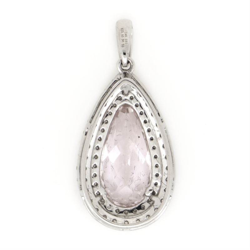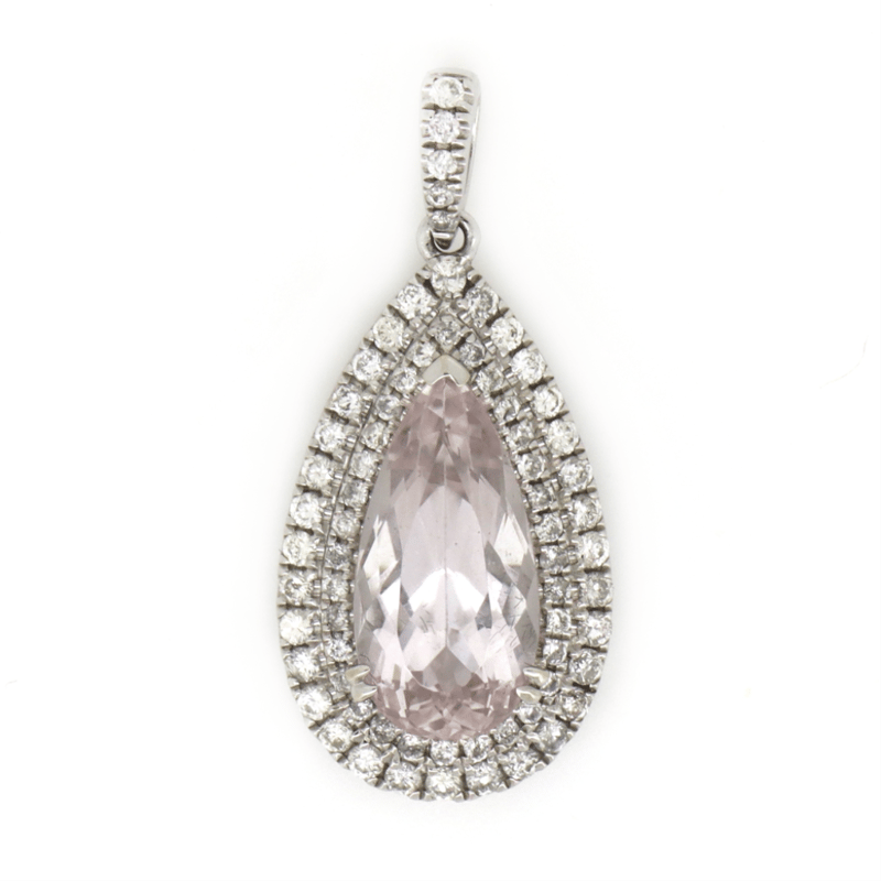 The Centre Features, One Pear Cut, Pinkish-Purple, Kunzite (3.93Ct, Eye Clean Clarity), Claw Set. Surrounding The Centre In A Double Halo And Decorating The Bail Are, 69 Round Brilliant Cut, Diamonds (0.55Ct Tdw, J-K Colour, Si2-I2 Clarity), Micro-Claw Set.