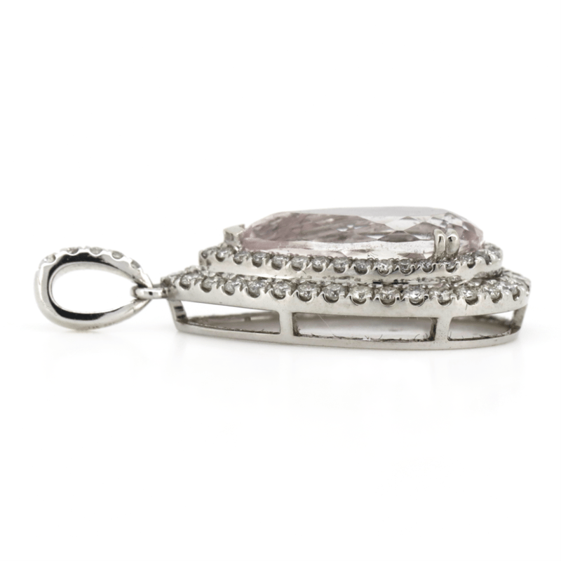 14K WHITE GOLD, KUNZITE AND DIAMOND, DOUBLE HALO PENDANT.