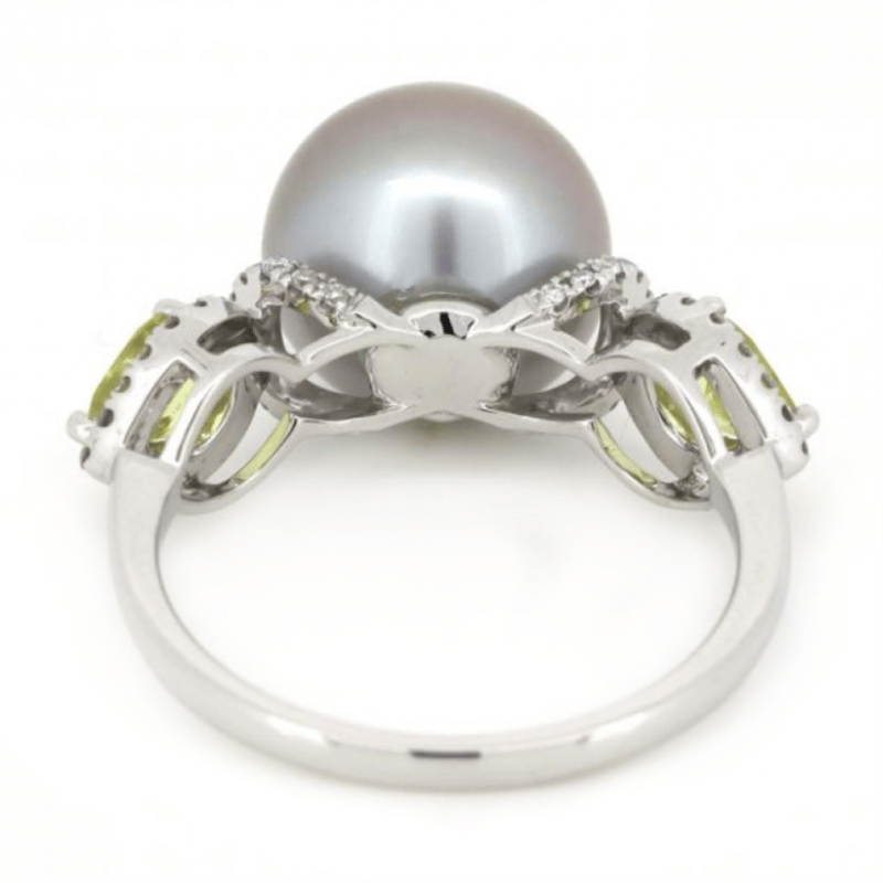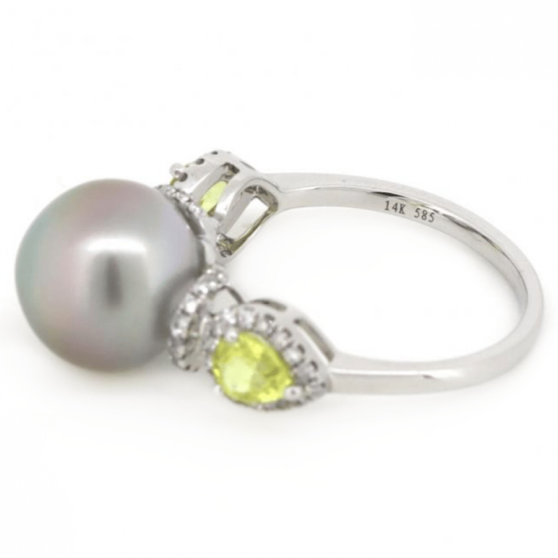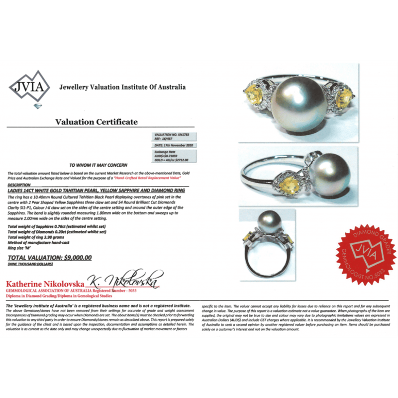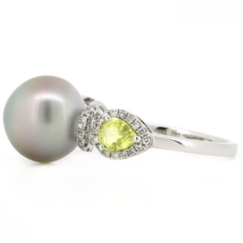 The Centre Features, One Near Round, Black With Pink Overtones, Cultured Tahitian Pearl (10.40Mm Size). Either Side Of The Centre Are, 2 Pear Cut, Yellow, Sapphires (0.76Ct Tsw), 3 Claw Set. Surrounding The Sapphires In Halos And Decorating The Setting Are, 54 Round Brilliant Cut, Diamonds (0.20Ct Tdw, J-K Colour, Si1-P1 Clarity), Claw Set. Ring Size M.