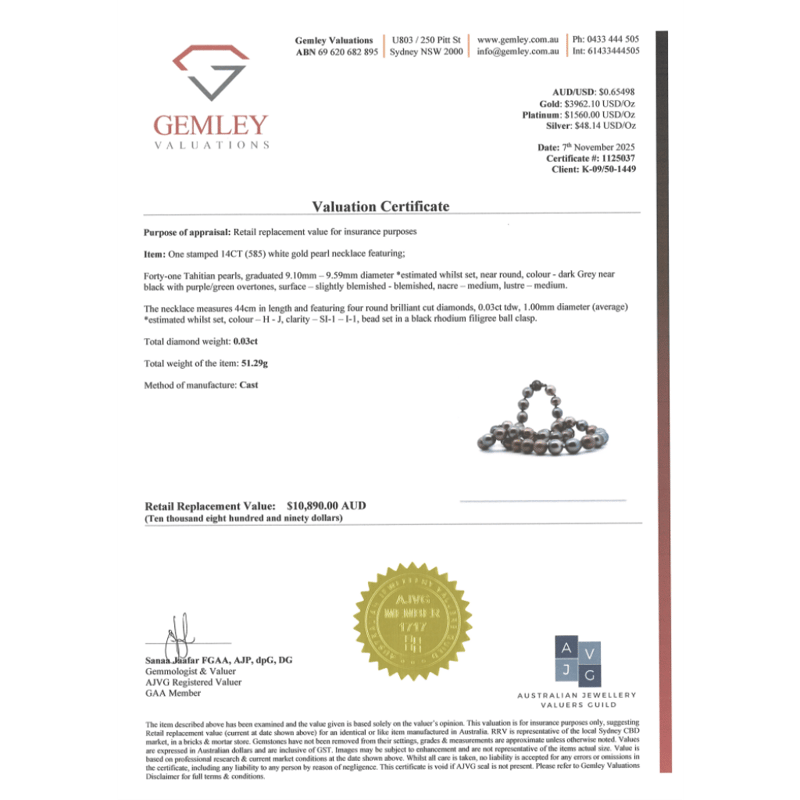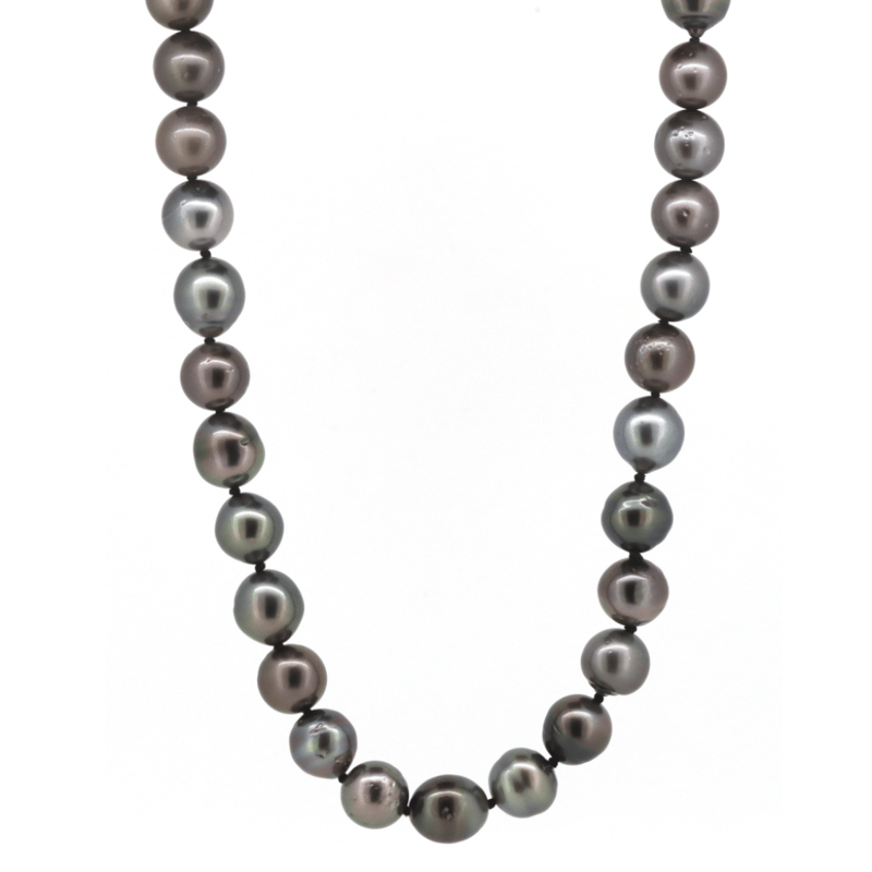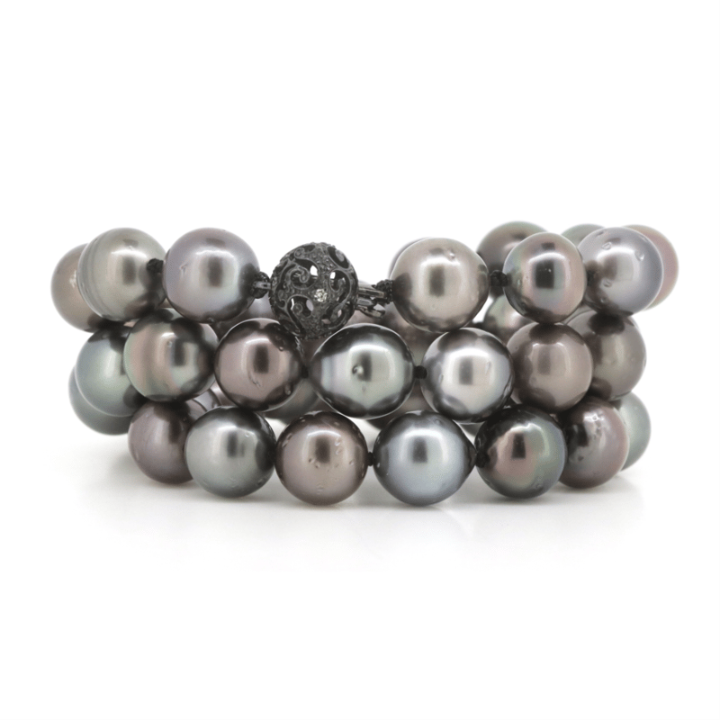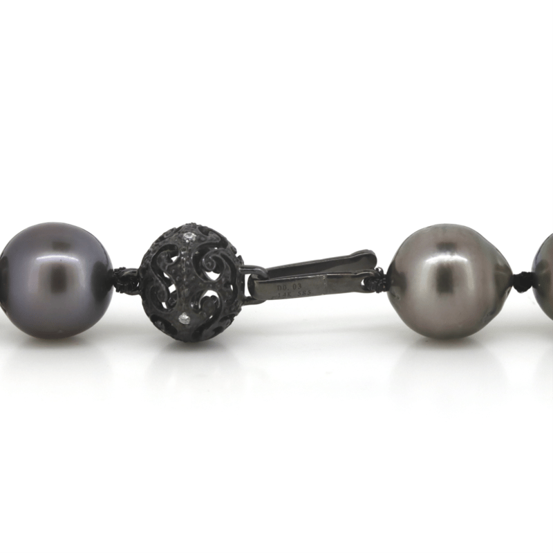 The Design Features, 41 Near Round, Black With Purple/Green Overtones, Cultured Tahitian Pearls (9.10Mm-9.59Mm Size, Medium Lustre, Slightly Blemished). Embellishing The Black Rhodium Plated Filigree Ball Clasp Are, 4 Round Brilliant Cut, Diamonds (0.03Ct Tdw, H-J Colour, Si1-I1 Clarity), Bead Set. Length Is 44Cm.