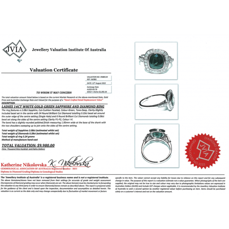 The Centre Features, One Cushion Faceted Cut, Deep Green, Sapphire (2.08Ct, Slightly Included), Bezel Set. Surrounding The Centre In A Halo And Decorating The Shoulders Are, 30 Round Brilliant Cut, Diamonds (0.39Ct Tdw, I-K Colour, P1-P2 Clarity), Bead Set. Ring Size N 1/2.