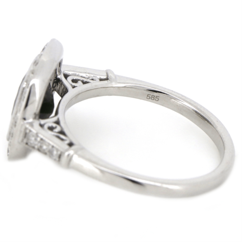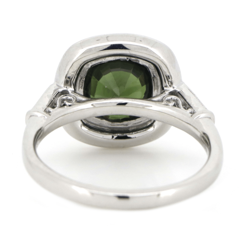 14K WHITE GOLD, GREEN SAPPHIRE AND DIAMOND, HALO RING.