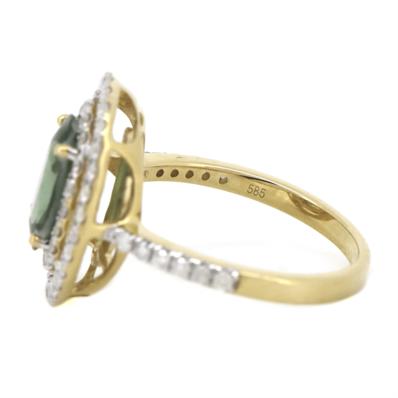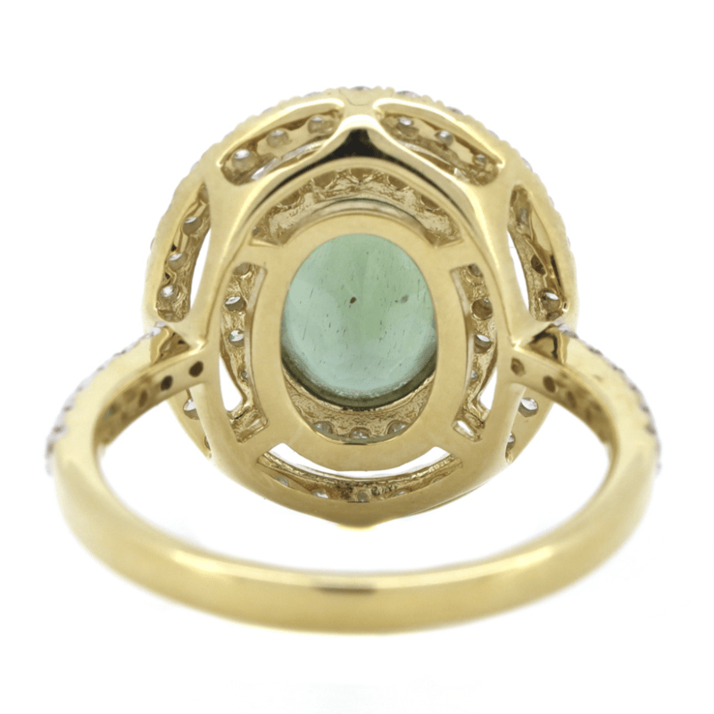 14K YELLOW GOLD, APATITE AND DIAMOND, DOUBLE HALO RING.