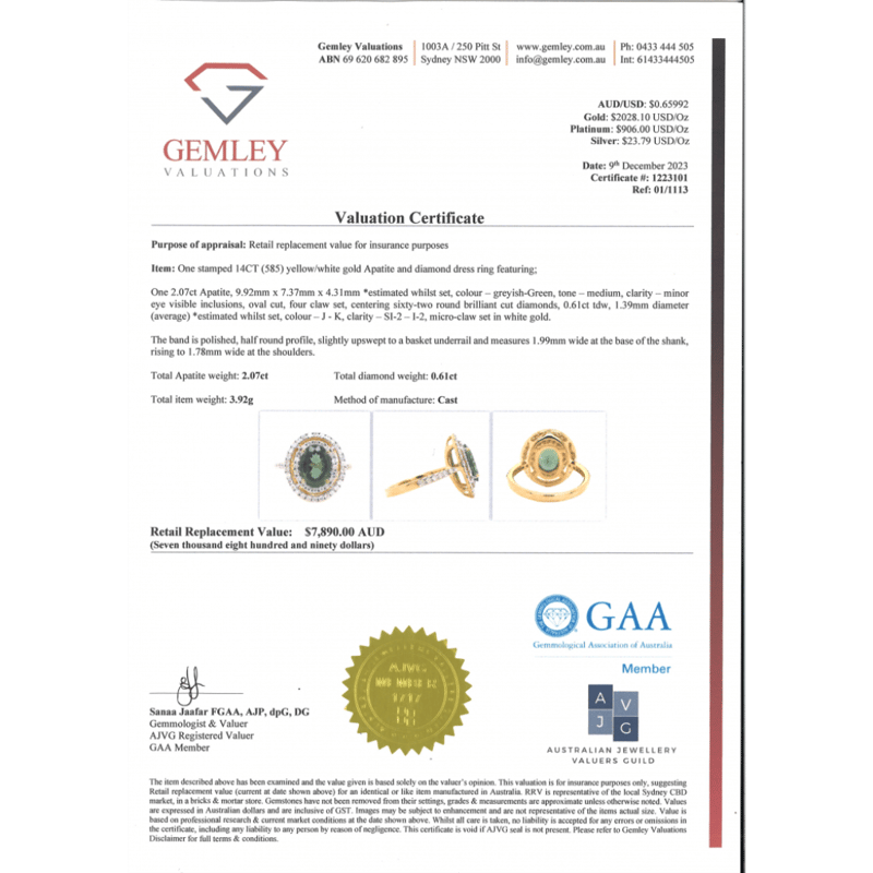 The Centre Features, One Oval Cut, Medium Greyish-Green, Apatite (2.07Ct, Minor Eye Visible Inclusions), 4 Claw Set. Surrounding The Centre In A Double Halo And Decorating The Shoulders Are, 62 Round Brilliant Cut, Diamonds (0.61Ct Tdw, J-K Colour, Si2-I2 Clarity), Micro Claw Set In White Gold. Ring Size N.