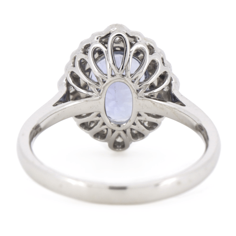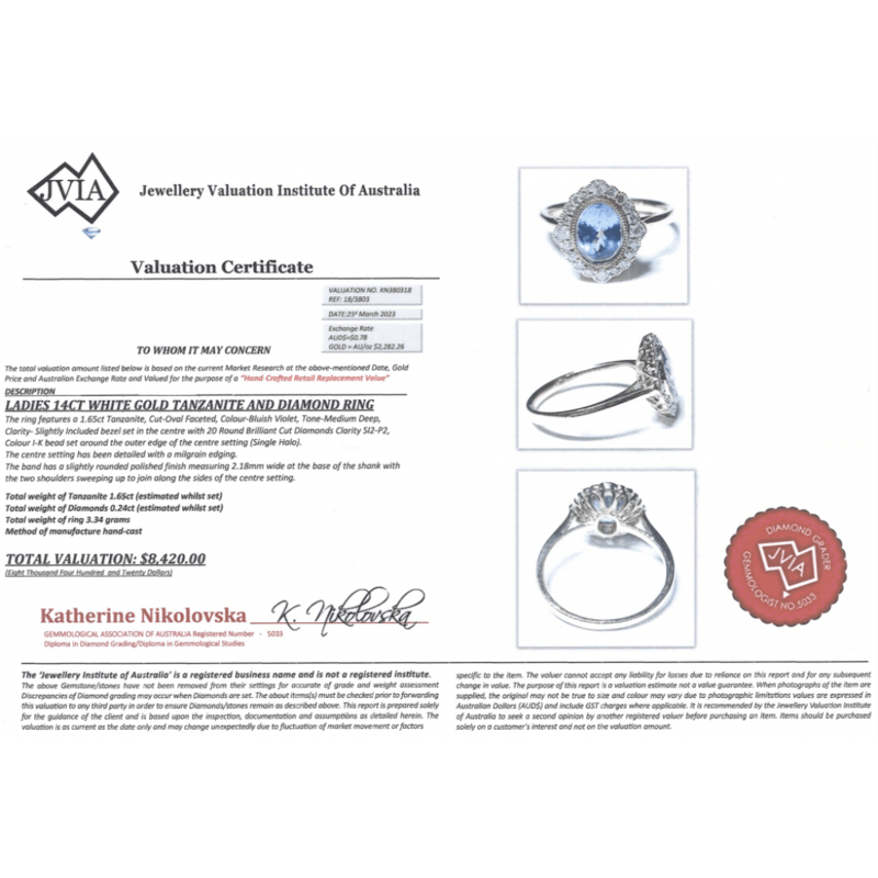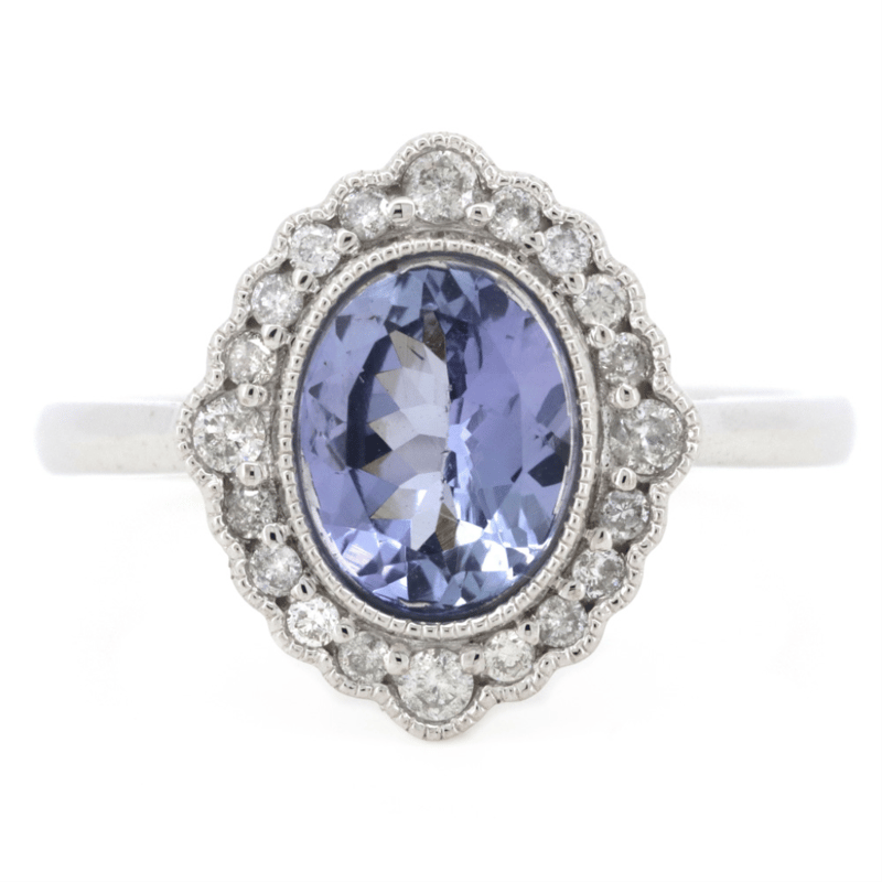 The Centre Features, One Oval Faceted Cut, Bluish-Violet, Tanzanite (1.65Ct, Slightly Included), Bezel Set. Surrounding The Centre In A Halo Are, 20 Round Brilliant Cut, Diamonds (0.24Ct Tdw, I-K Colour, Si2-P2 Clarity), Bead Set. Ring Size M 1/2.