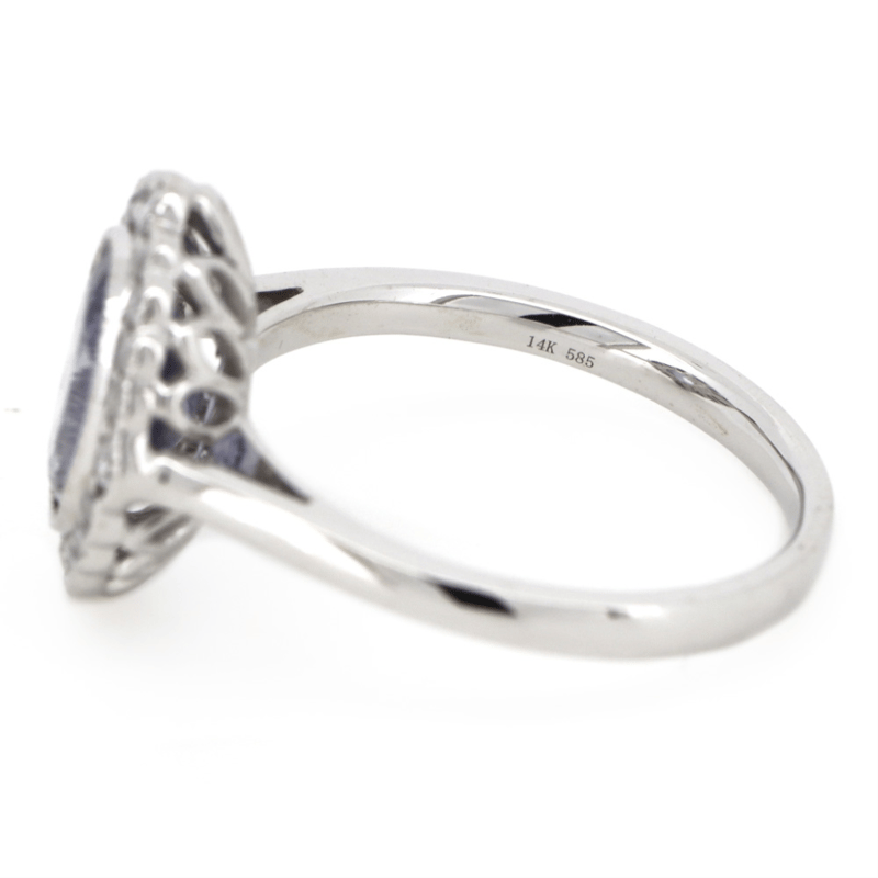 14K WHITE GOLD, TANZANITE AND DIAMOND, HALO RING.