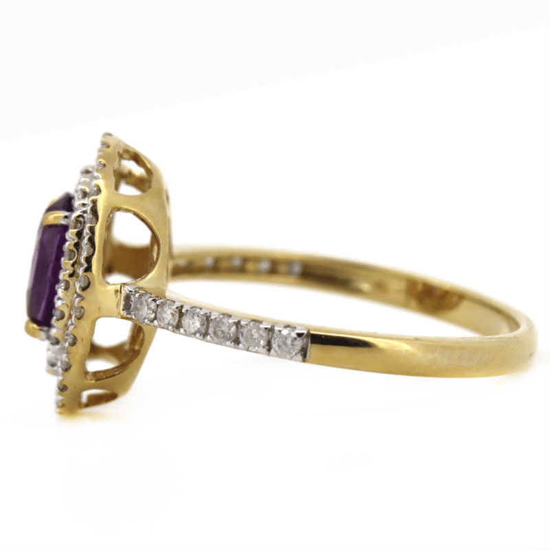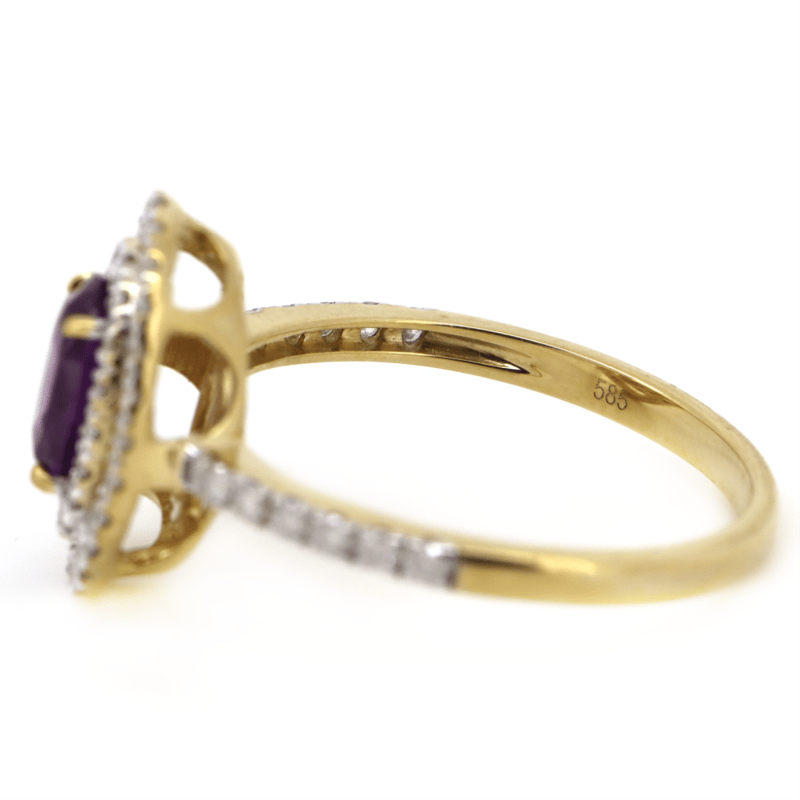 14K YELLOW GOLD, PINK SAPPHIRE AND DIAMOND, DOUBLE HALO RING.