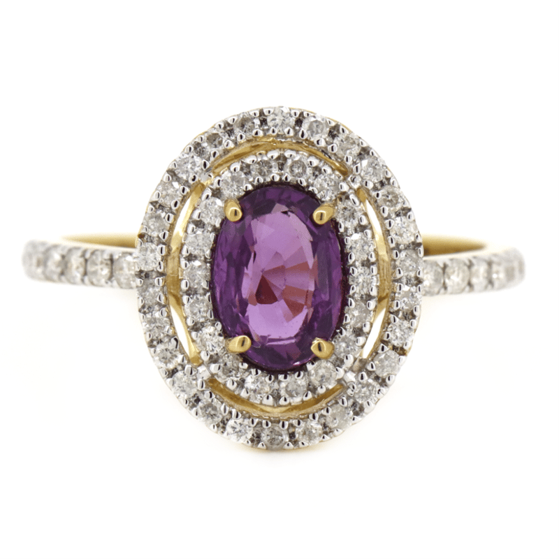 The Centre Features, One Oval Cut, Medium Purplish-Pink, Sapphire (0.92Ct, Minor Eye Visible Inclusions), 4 Claw Set. Surrounding The Centre In A Double Halo And Decorating The Band Are, 56 Round Brilliant Cut, Diamonds (0.36Ct Tdw, J-K Colour, Si2-I2 Clarity), Micro-Claw Set In White Gold. Ring Size M.