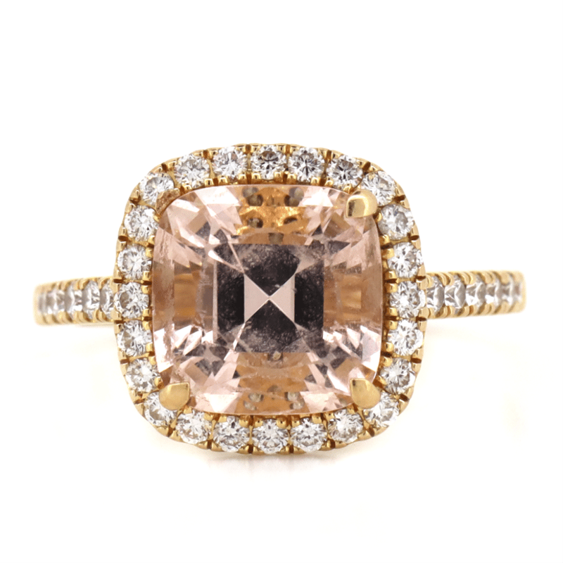 The Centre Features, One Cushion Cut, Peach Morganite (3.60Ct, Eye Clean, Abraded), Claw Set. Encompassing The Centre In A Halo Are, 68 Round Brilliant Cut, Diamonds (1.01Ct Tdw, G Colour, Si Clarity), Bead Set. Ring Size O. Condition: Pre-Owned.