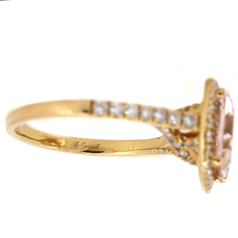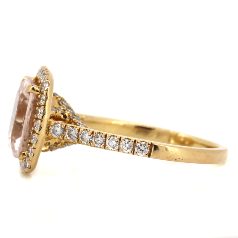 18K YELLOW GOLD, MORGANITE AND DIAMOND, HALO RING.
