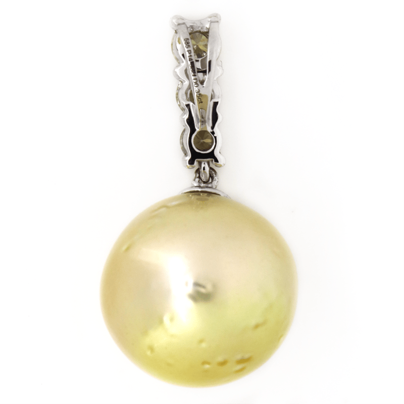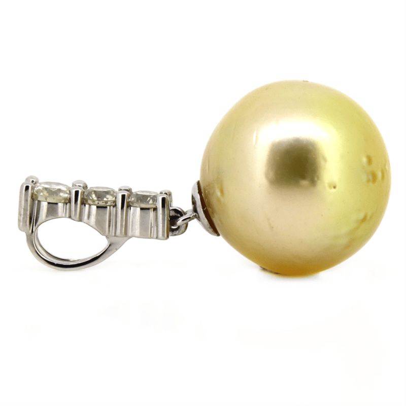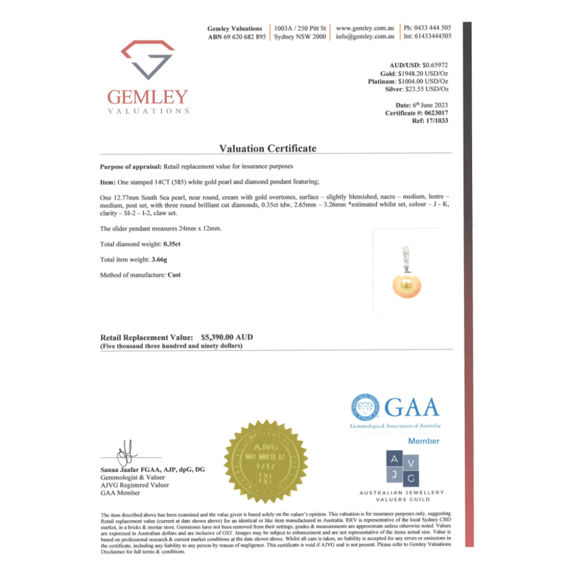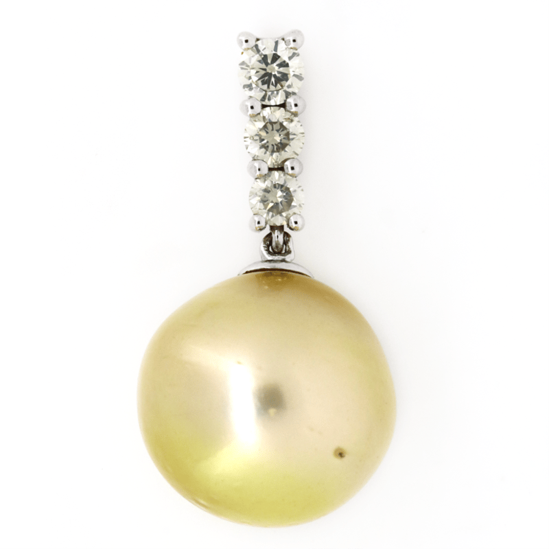 14K WHITE GOLD, GOLDEN CULTURED SOUTH SEA PEARL AND DIAMOND, DROP PENDANT. The Design Features, One Near Round, Cream With Golden Overtones, Cultured South Sea Pearl (12.77Mm Size, Medium Lustre, Slightly Blemished), Set As The Lower Drop. Surmounted By, 3 Round Brilliant Cut, Diamonds (0.35Ct Tdw, J-K Colour, Si2-I2 Clarity), Claw Set. Valuations Provided by an Independent Third-Party Professional Not Directly Associated With Lloyds Auctions at AUD $$5,390.00This valuation has been conducted by an independent third-party professional. The valuation amount is an assessment by the issuing valuer and does not reflect the auction value of the item. Any inquiries regarding the valuation should be directed to the issuing valuer (refer to contact details on the certificate), as Lloyds Auctions has no affiliation or influence over the valuation, the valuer, or the stated amount. Condition: Good - Refer Images 0645957+1342