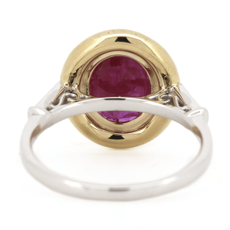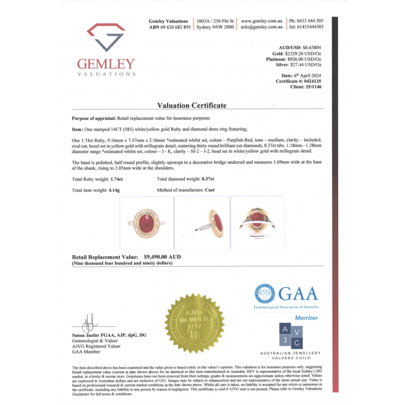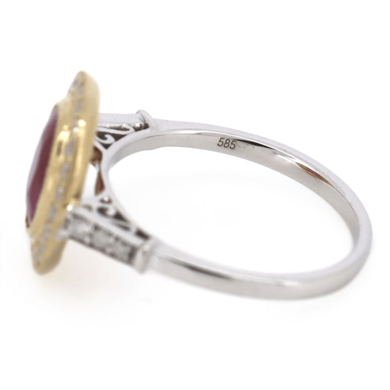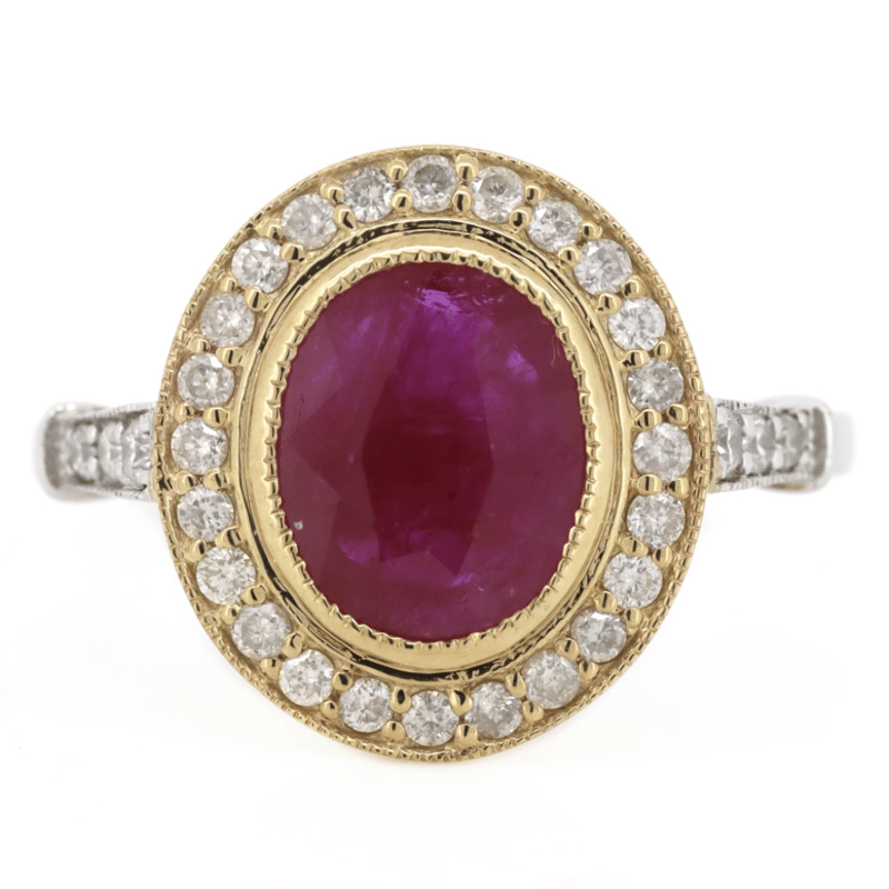 14K YELLOW/WHITE GOLD, RUBY AND DIAMOND, HALO RING. The Centre Features, One Oval Cut, Medium Purplish-Pink, Ruby (1.74Ct, Included), Bezel Set In Yellow Gold With Millegrain Detail. Surrounding The Centre In A Halo And Decorating The Band Are, 30 Round Brilliant Cut, Diamonds (0.37Ct Tdw, J-K Colour, Si2-I2 Clarity), Bead Set In Yellow/White Gold With Millegrain Detail. Ring Size O 1/2. Valuations Provided by an Independent Third-Party Professional Not Directly Associated With Lloyds Auctions at AUD $$9,490.00This valuation has been conducted by an independent third-party professional. The valuation amount is an assessment by the issuing valuer and does not reflect the auction value of the item. Any inquiries regarding the valuation should be directed to the issuing valuer (refer to contact details on the certificate), as Lloyds Auctions has no affiliation or influence over the valuation, the valuer, or the stated amount. Condition: Good - Refer Images 0645957+1343