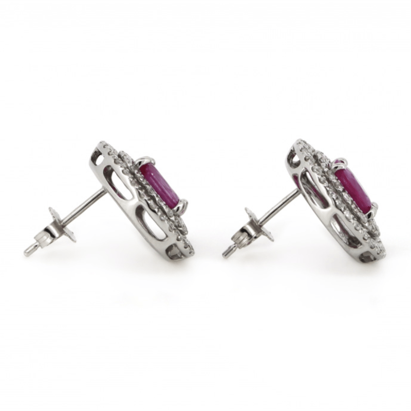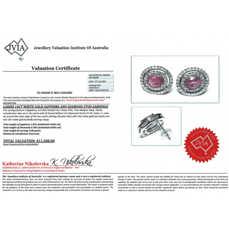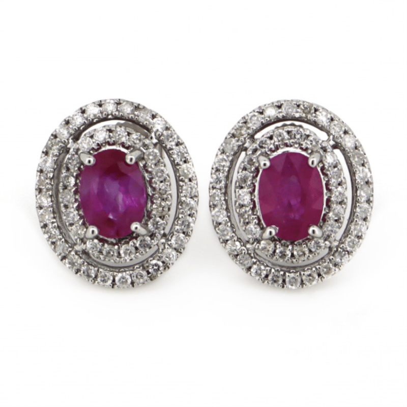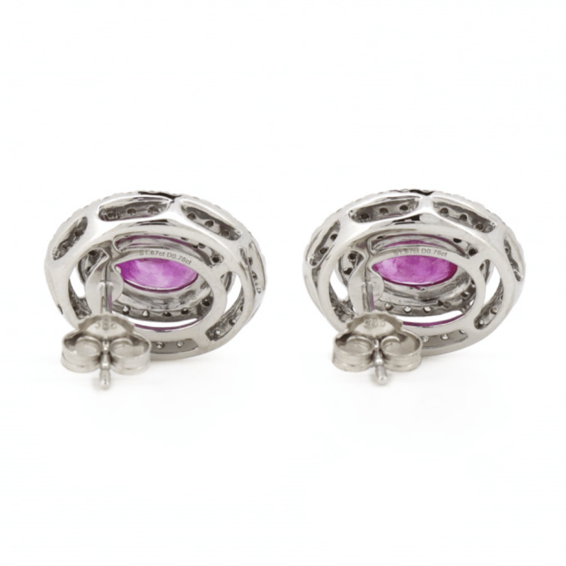 The Centres Feature, 2 Oval Faceted Cut, Medium Deep Pink, Sapphires (1.67Ct Tsw, Included), 4 Claw Set. Surrounding The Centres In Double Halos Are, 92 Round Brilliant Cut, Diamonds (0.76Ct Tdw, J-L Colour, P1-P2 Clarity), Claw Set. The Earrings Have Post Backs, With 14K White Gold Butterfly Clasps. Condition: New.