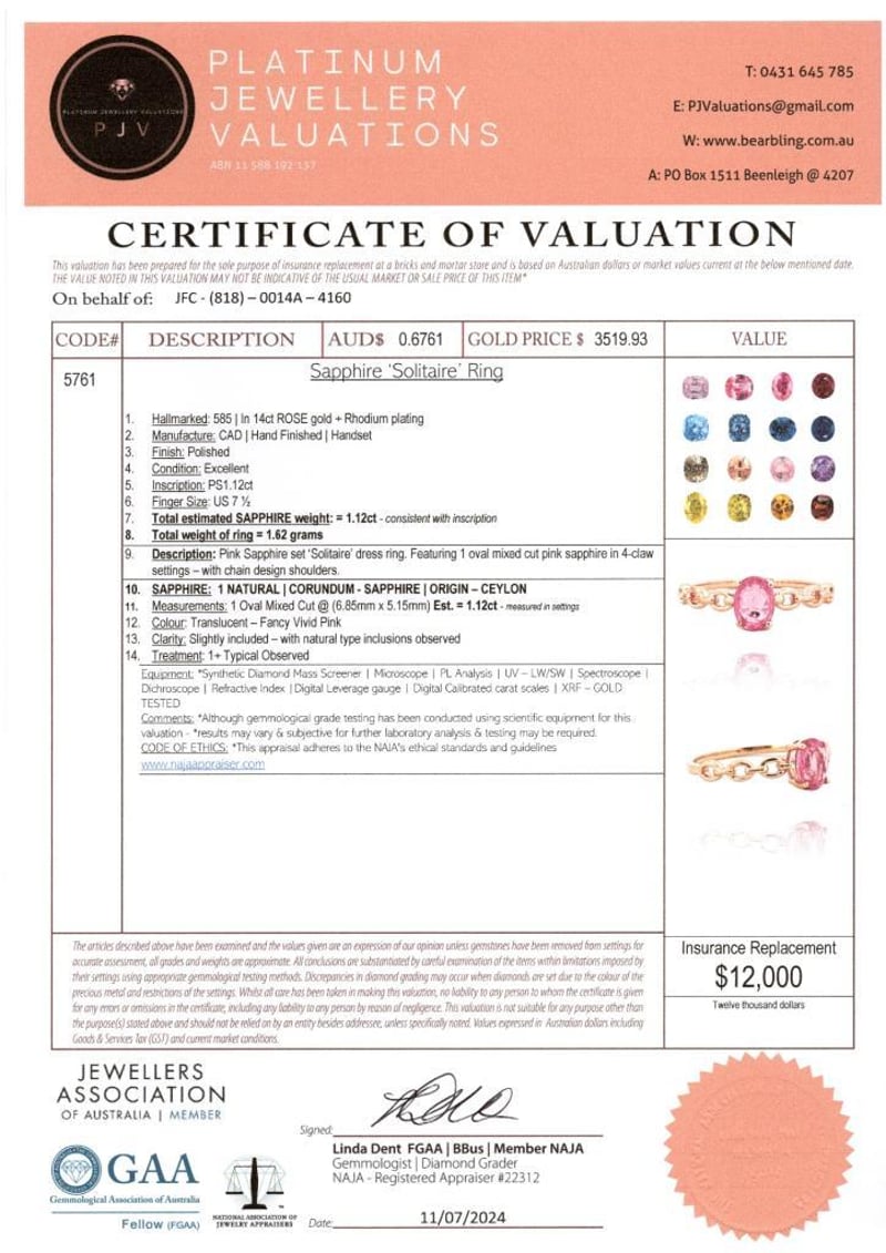 Featuring Centre, One Oval Cut, Fancy Vivid Pink Ceylon Sapphire (1.12Ct, Slightly Included), Claw Set. Ring Size O.