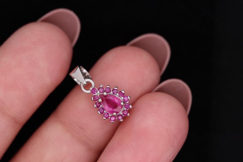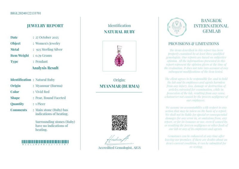NATURAL BURMESE RUBY PENDANT ON 925 SILVER - WITH CERTIFICATE Gemstone : Natural Burmese RubyCertificate Number : Bigl20240122133701Item Total Weight : 0.79 GramsGemstone Color : Vivid RedShape : Pear, Round FacetedMeasurement/Size : N/AComments : Main Stone (Ruby) Has Indications Of Heating. Surrounding Stones (Ruby) Have No Indications Of Heating. ✻ Verify Report Online At Www.Bangkokinternationalgemlab.Co Condition: Good - Refer Images 01611166+9