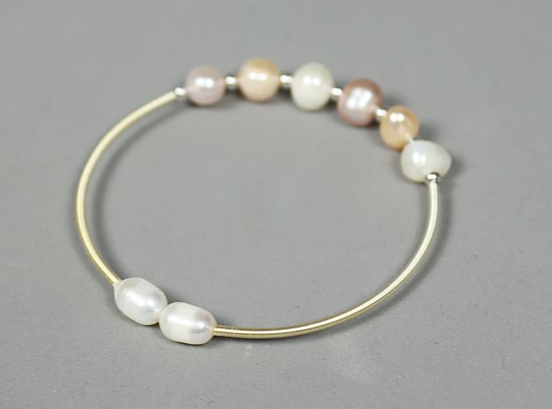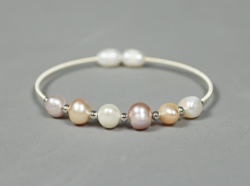 FRESHWATER PEARL ON 925 SILVER CUFF BANGLE - ORANGE & PINK