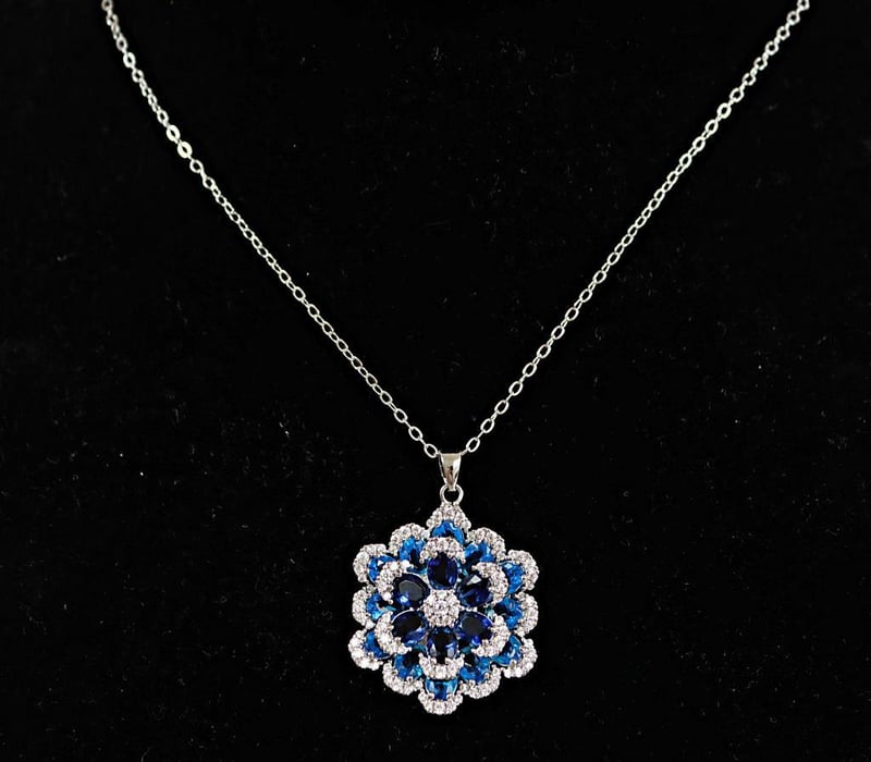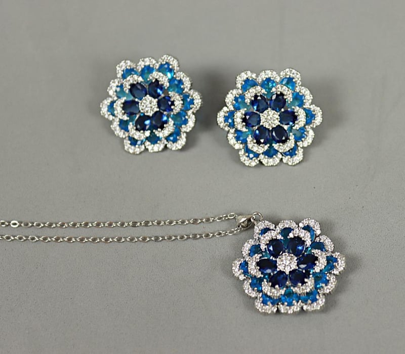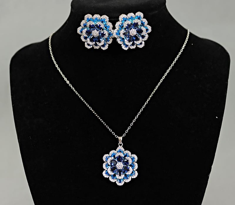 925 STERLING SILVER FLORAL NECKLACE & STUDS - BLUE
