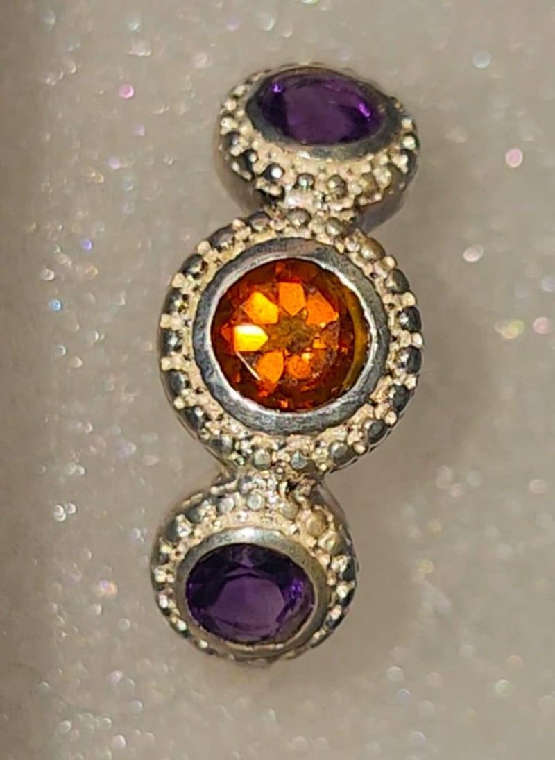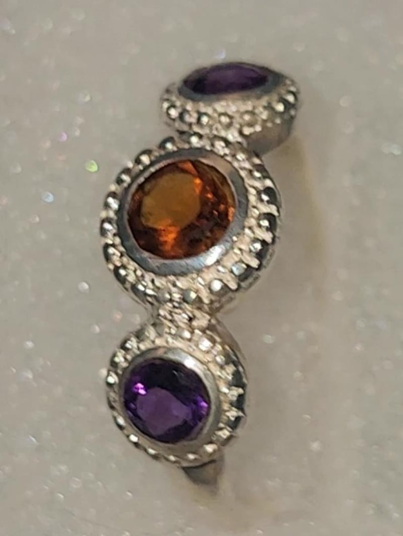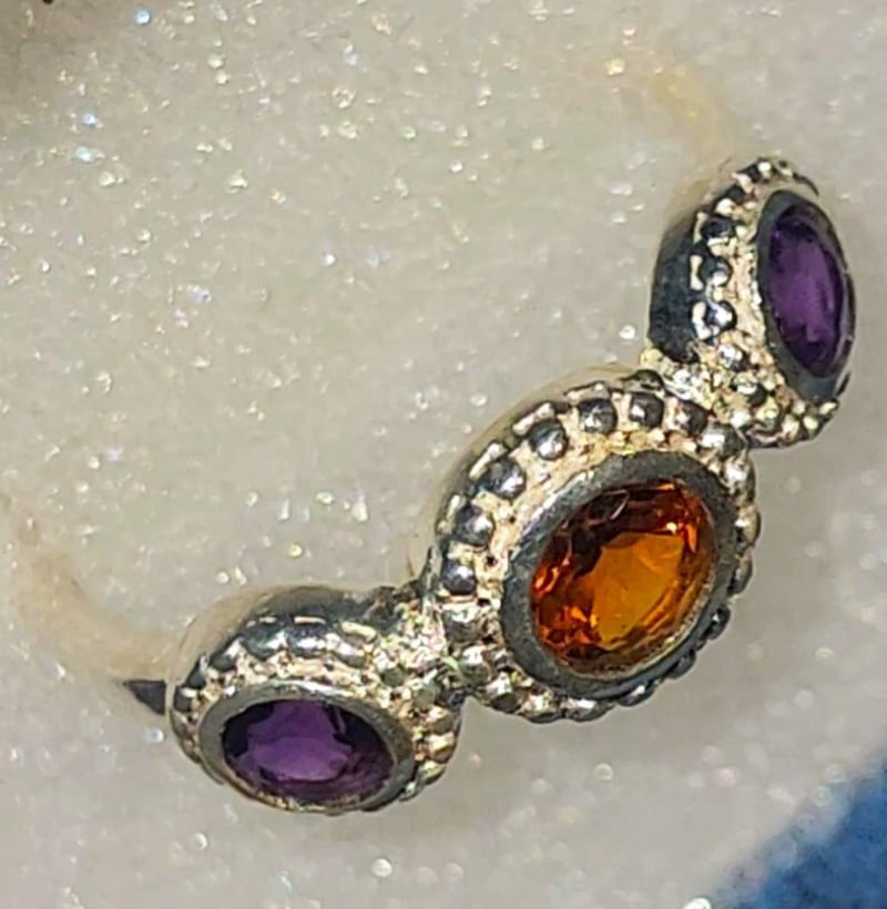 14 CARATS STERLING SILVER AMETHYST AND CITRINE RING.