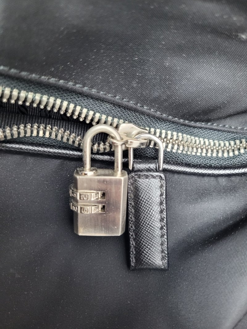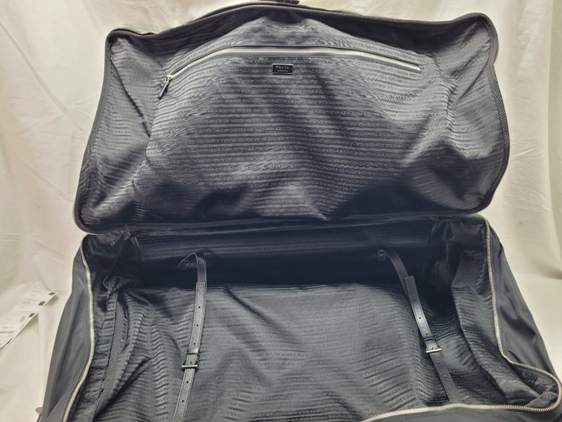 Re-Nylon, Embellished With Saffiano Leather Details. The Roomy, Versatile Suitcase Characterized By The Leather Handle And Two Wheels Is Completed By The Iconic Signature Touch Of The Enameled Metal Triangle Logo. Also Includes Blue Fabric Dust Cover And Combination Lock, Code 00