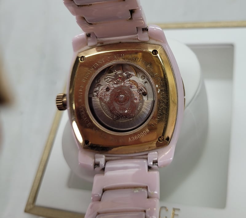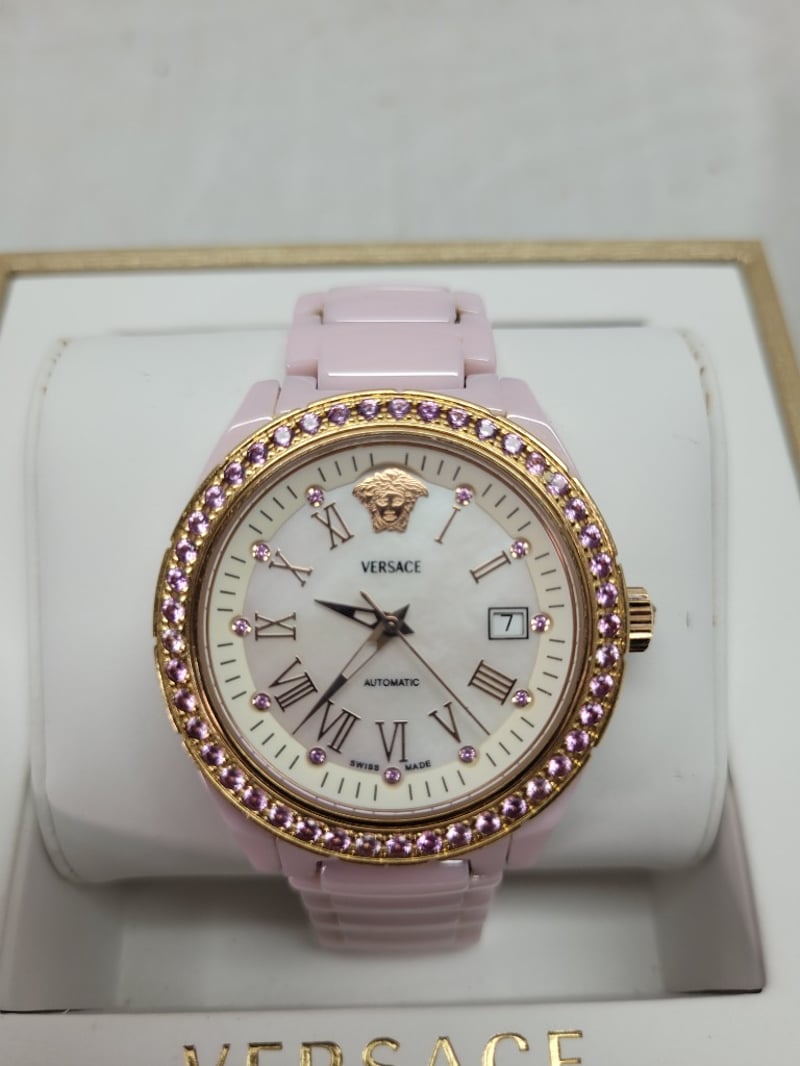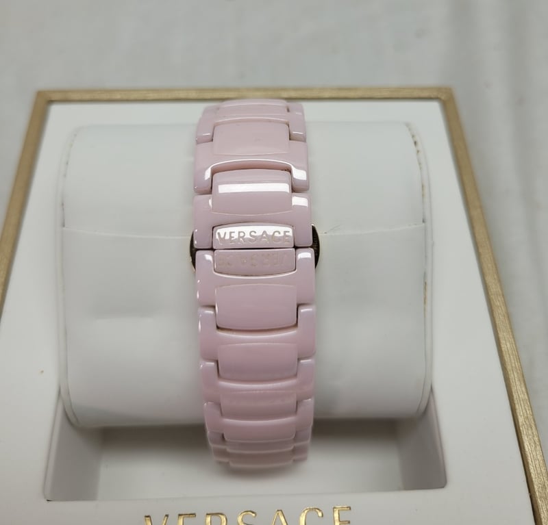 VERSACE MOTHER OF PEARL PINK CERAMIC PINK SAPPHIRE ROSE GOLD PLATED STAINLESS STEEL