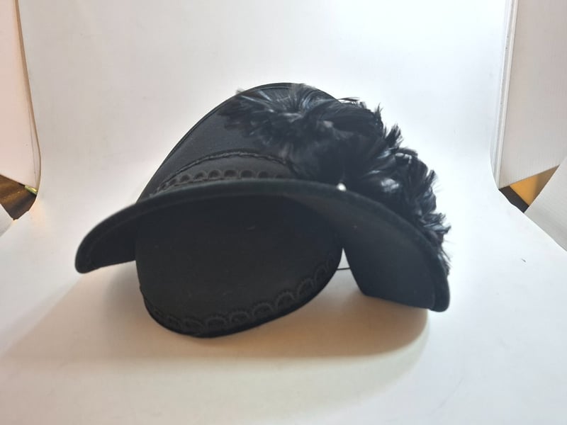 Charming Pair Of Mid-Century Ladies' Formal Hats Featuring A Striking Pink Wool Felt Cloche-Style Hat With Elegant Gathered Band And Gold Accent Detail, Paired With An Elaborate Black Sculptural Hat Adorned With Faux Feather Plumage, Pearl Bead Embellishments, And Decorative Ribbon Band. Both Pieces Exemplify Classic Millinery Craftsmanship With Structured Crowns And Refined Finishing.
