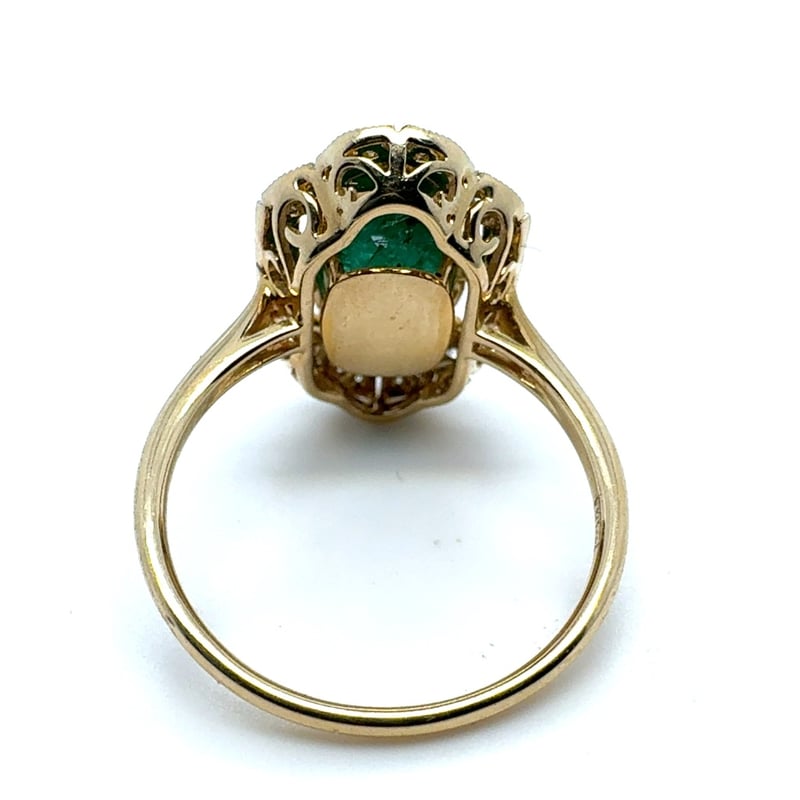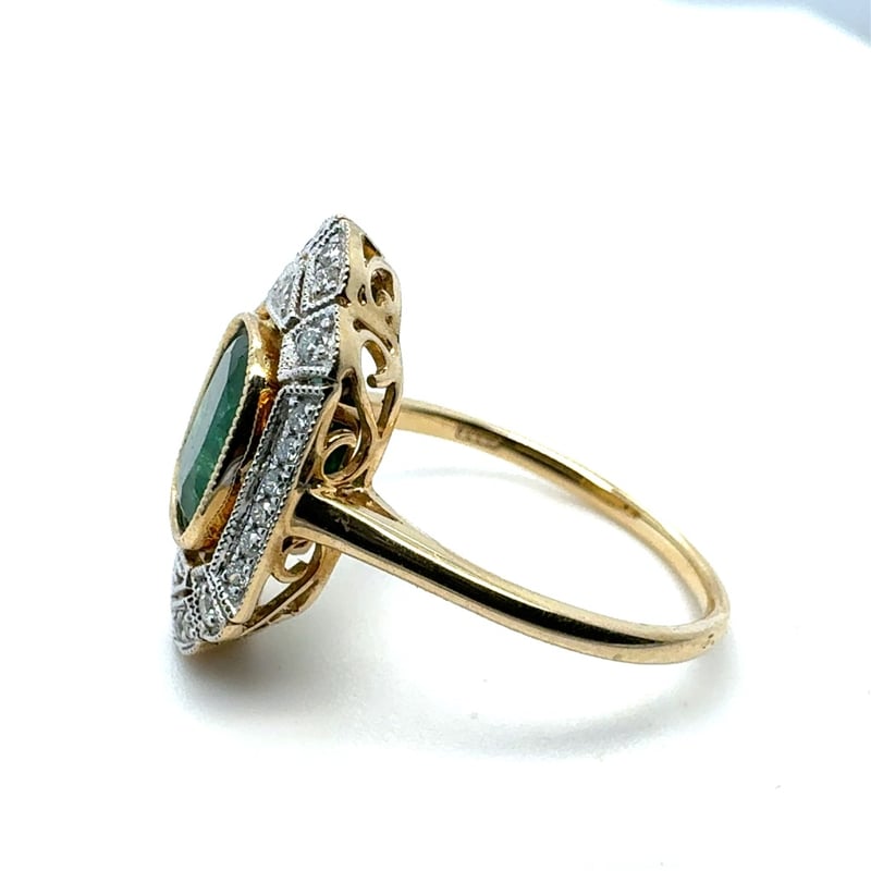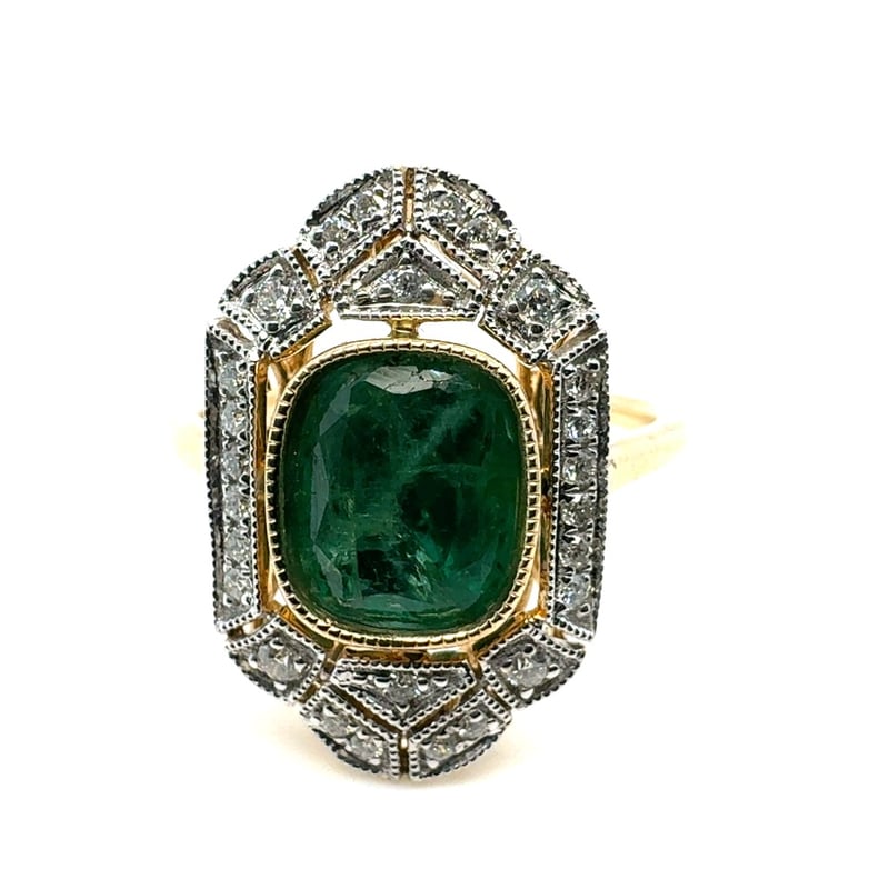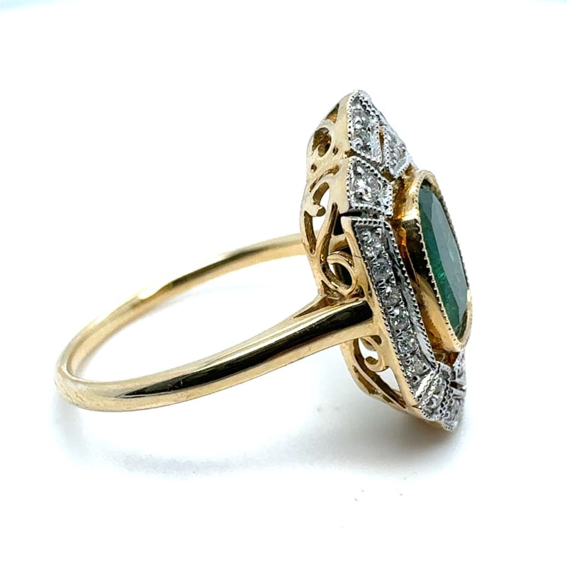 14CT YELLOW GOLD CUSHION CUT EMERALD AND DIAMOND RING