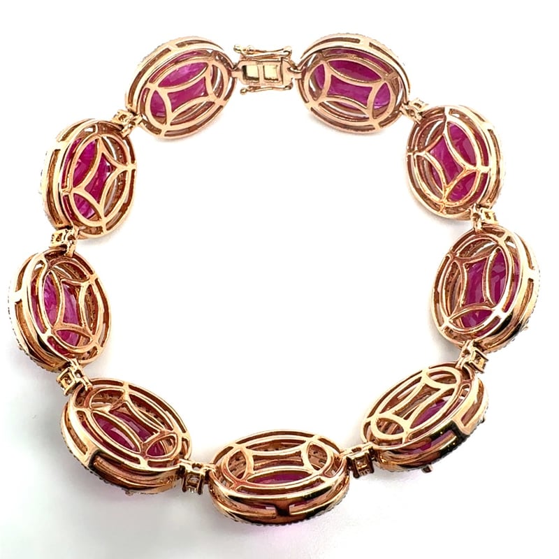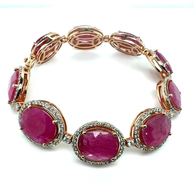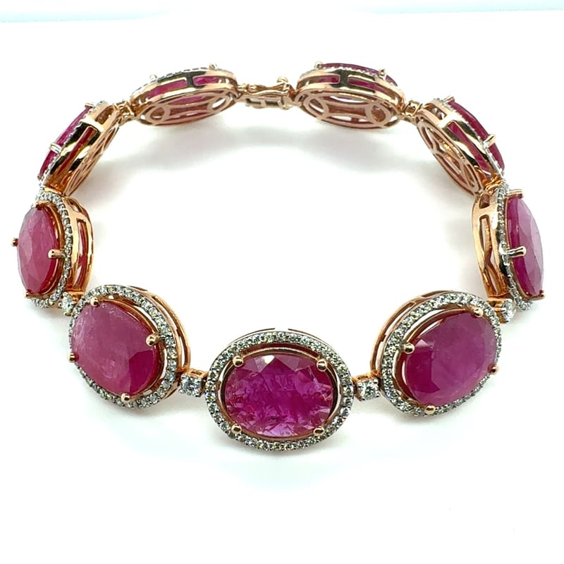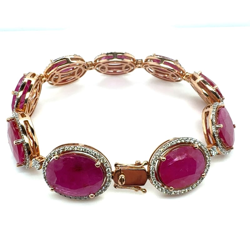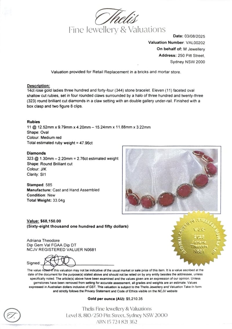 14CT ROSE GOLD OVAL CUT RUBY AND DIAMOND BRACELETR = 47.96CtD = 2.76CtVal #00202Condition: Good - Refer To ImagesThis valuation has been conducted by an independent third-party professional. The valuation amount is an assessment by the issuing valuer and does not reflect the auction value of the item.Any inquiries regarding the valuation should be directed to the issuing valuer (refer to contact details on the certificate), as Lloyds Auctions has no affiliation or influence over the valuation, the valuer, or the stated amount.Insurance Replacement Valuation Amount: $68,150.00488487+116