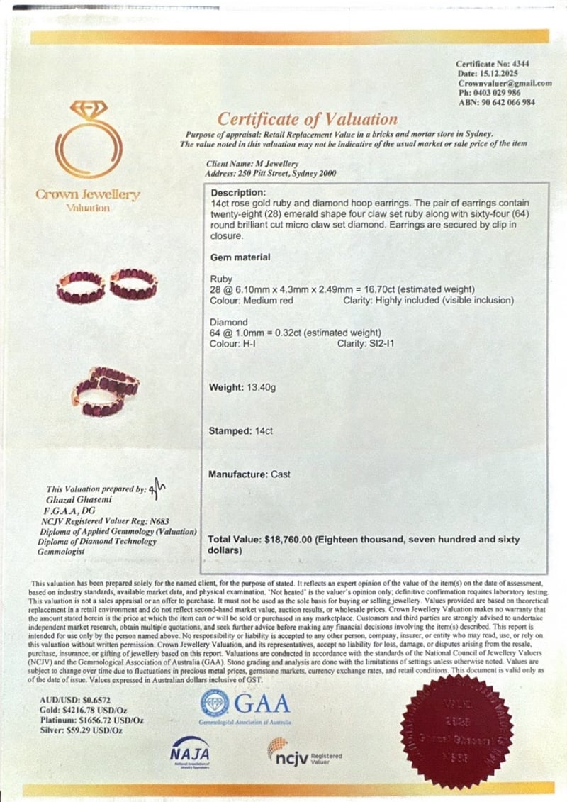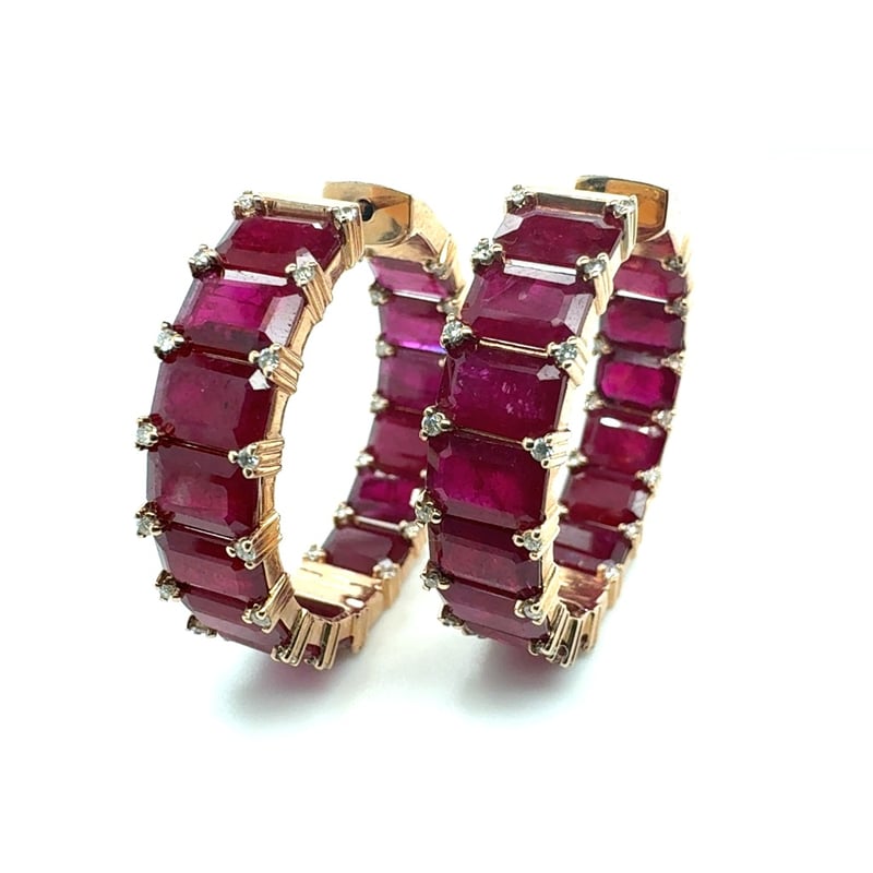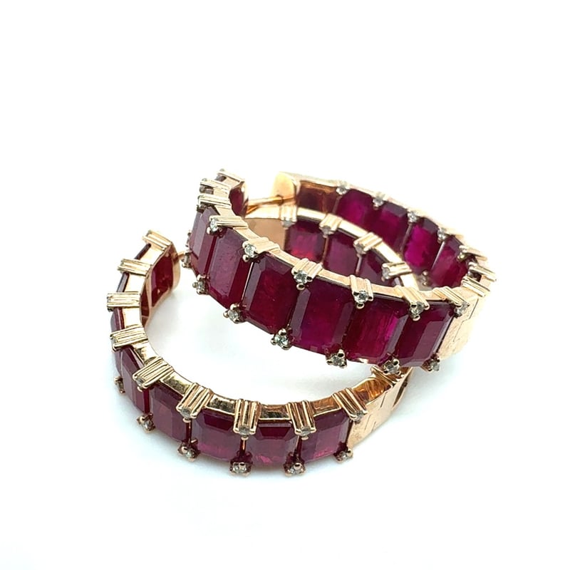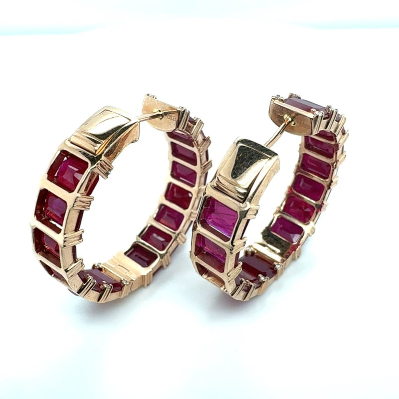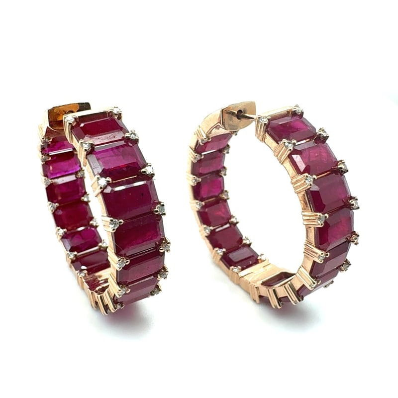 14CT ROSE GOLD EMERALD CUT RUBY AND DIAMOND HOOP EARRINGS