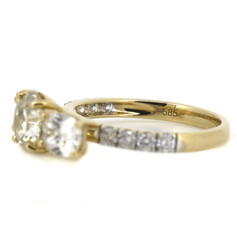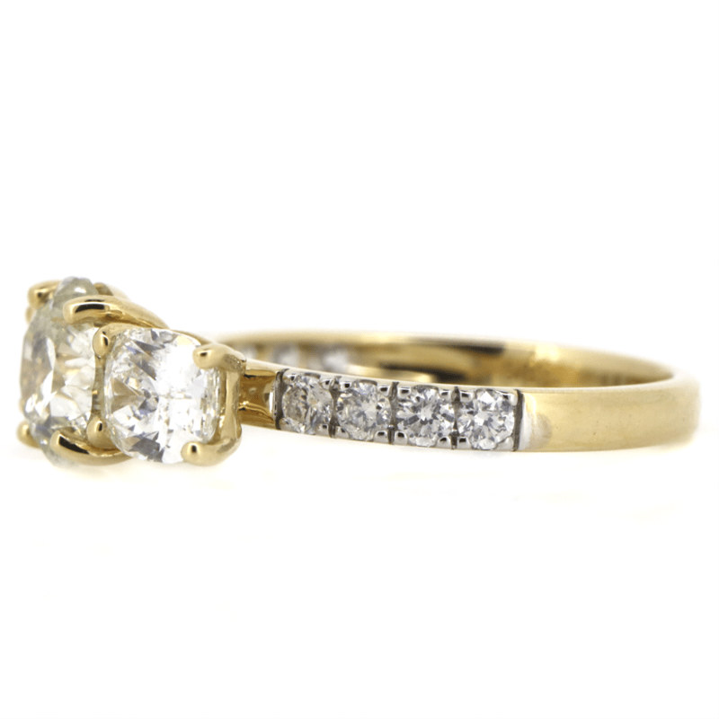 The Centre Features, One Round Brilliant Cut, Diamond (1.51Ct, L-M Colour, I2 Clarity), Claw Set. Flanking The Centre Are, 2 Cushion Cut, Diamonds (1.44Ct Tdw, G Colour, Si2 Clarity), Claw Set. Decorating The Band Are, 8 Round Brilliant Cut, Diamonds (0.296Ct Tdw, G-I Colour, Si-I2 Clarity), Claw Set. Ring Size M 1/2.