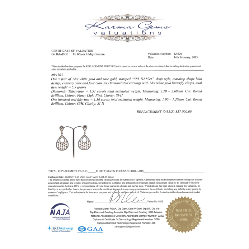 The Earrings Feature, 34 Round Brilliant Cut, Fancy Light Pink, Diamonds (1.51Ct Tdw, Si-I1 Clarity), 4 Claw Set. Surrounding The Design In Halos Are, 152 Round Brilliant Cut, Diamonds (1.36Ct Tdw, G-H Colour, Si-I1 Clarity), Claw Set. The Earrings Have Post Backs, With 14K White Gold Butterfly Clasps.
