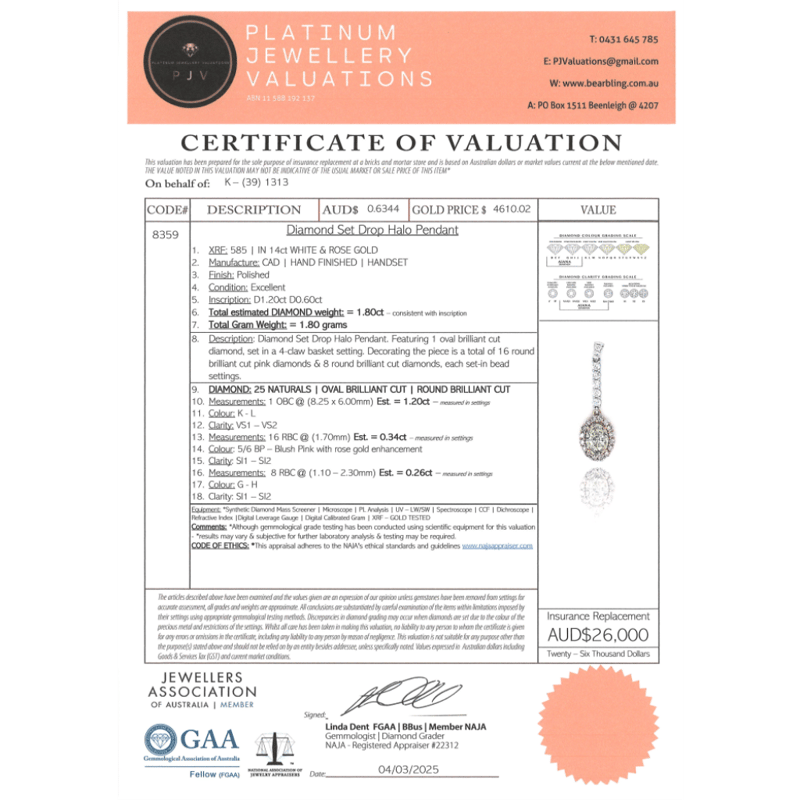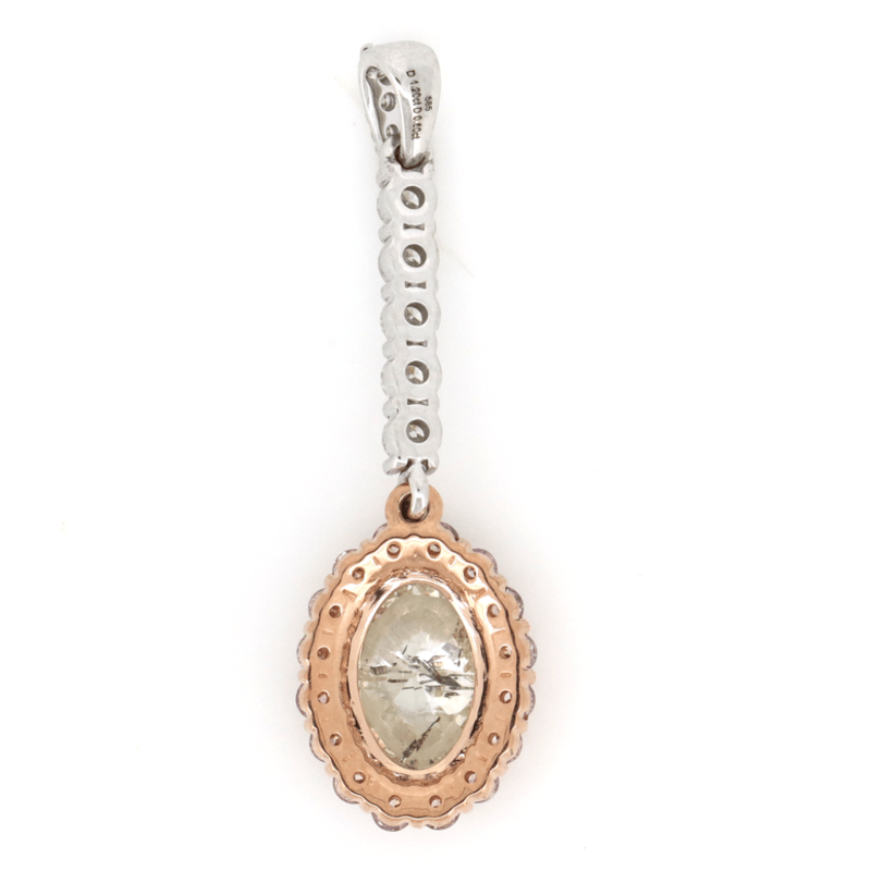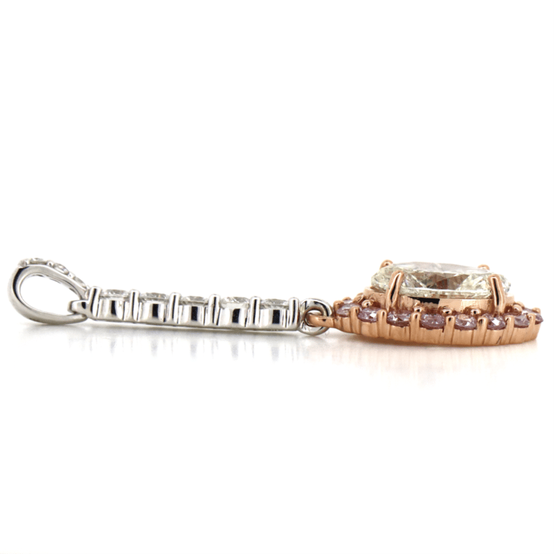 The Pendant Features, One Oval Brilliant Cut, Diamond (1.20Ct Tdw, K-L Colour, Vs1-Vs2 Clarity), 4 Claw Set. Encompassing The Centre Diamond Are, 16 Round Brilliant Cut, Blush Pink, Diamonds (0.34Ct Tdw, Si1-Si2 Clarity), Claw Set. Decorating The Pendant Drop Are 8 Round Brilliant Cut, Diamonds (0.26Ct Tdw, G-H Colour, Si1-Si2 Clarity), Claw Set.