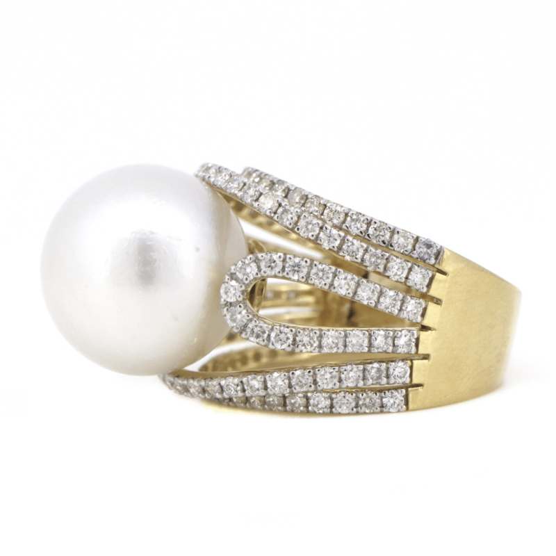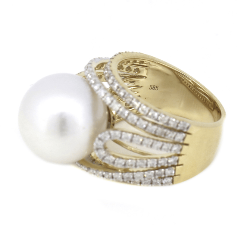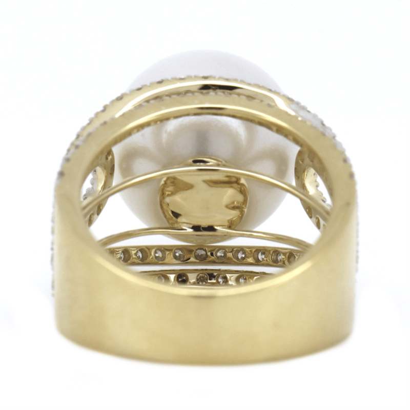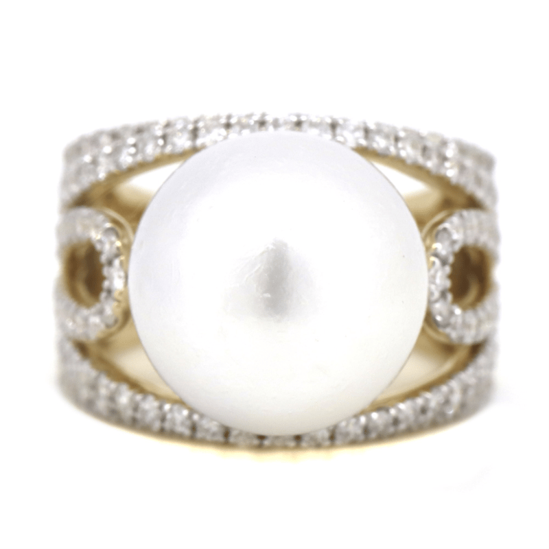 14K YELLOW GOLD, WHITE CULTURED SOUTH SEA PEARL AND DIAMOND, COCKTAIL RING.