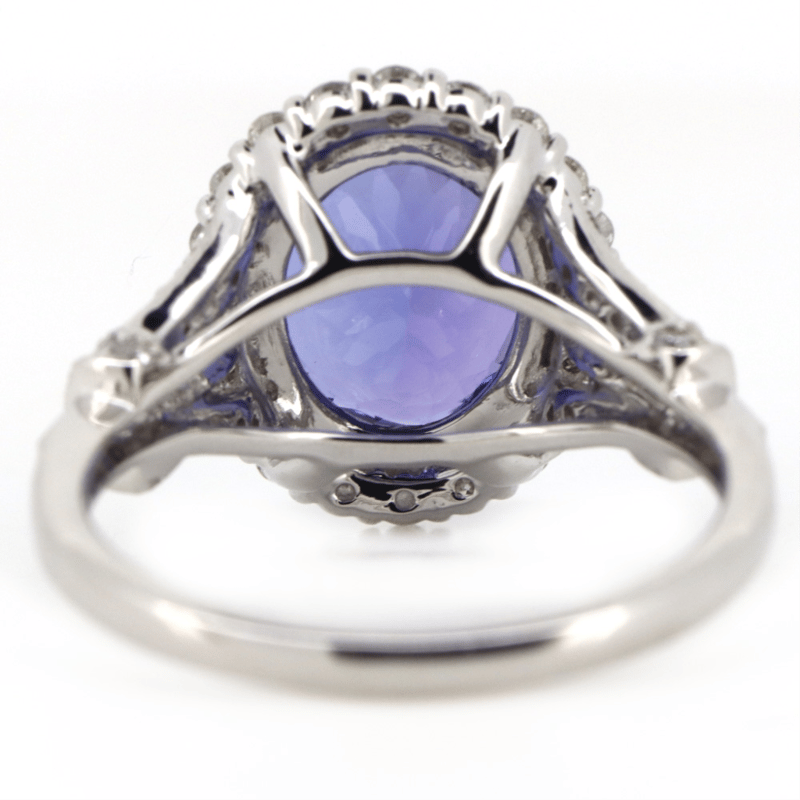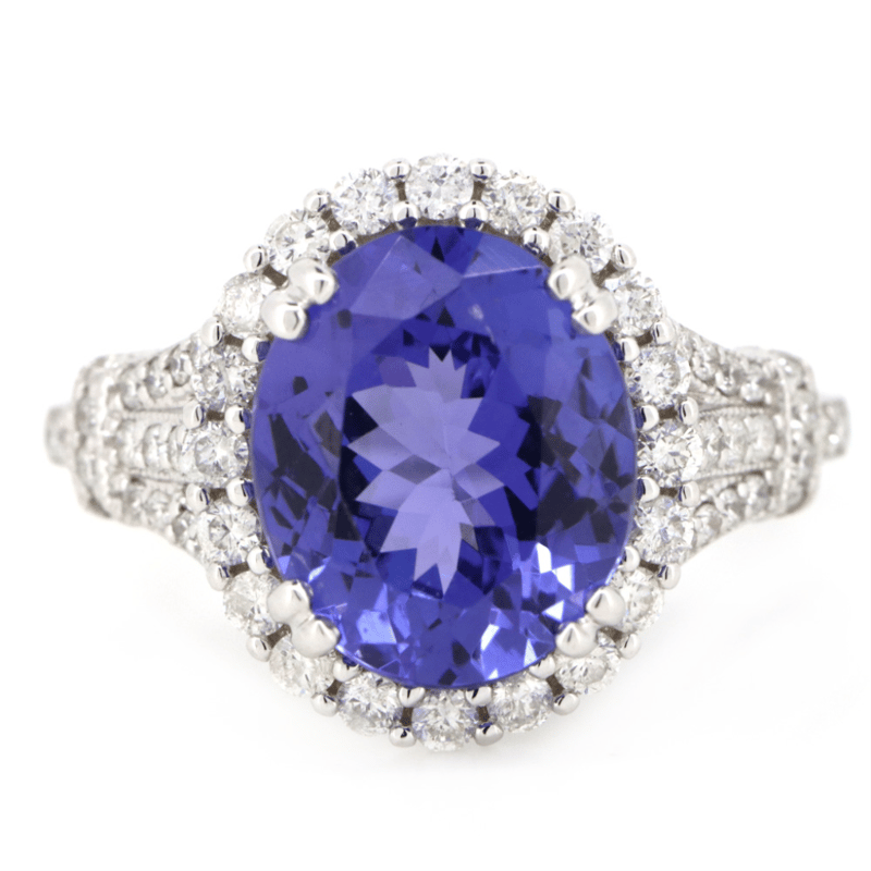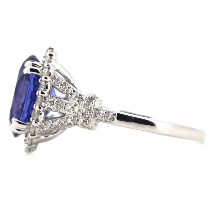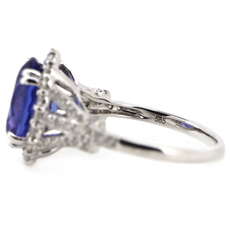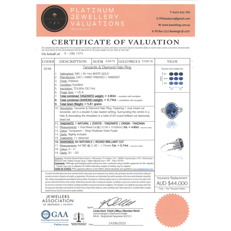 14K WHITE GOLD, TANZANITE AND DIAMOND, HALO RING. The Centre Features, One Oval Cut, Deep Purplish-Blue, Tanzanite (4.80Ct, Slightly Included), Double Claw Set. Surrounding The Centre In A Halo And Decorating The Shoulders Are, 64 Round Brilliant Cut, Diamonds (0.74Ct Tdw, G-H Colour, Si1-Si2 Clarity), Bead Set. Ring Size O 1/2. Valuations Provided by an Independent Third-Party Professional Not Directly Associated With Lloyds Auctions at AUD $$44,000.00This valuation has been conducted by an independent third-party professional. The valuation amount is an assessment by the issuing valuer and does not reflect the auction value of the item. Any inquiries regarding the valuation should be directed to the issuing valuer (refer to contact details on the certificate), as Lloyds Auctions has no affiliation or influence over the valuation, the valuer, or the stated amount. Condition: Good - Refer Images 0645956+5216