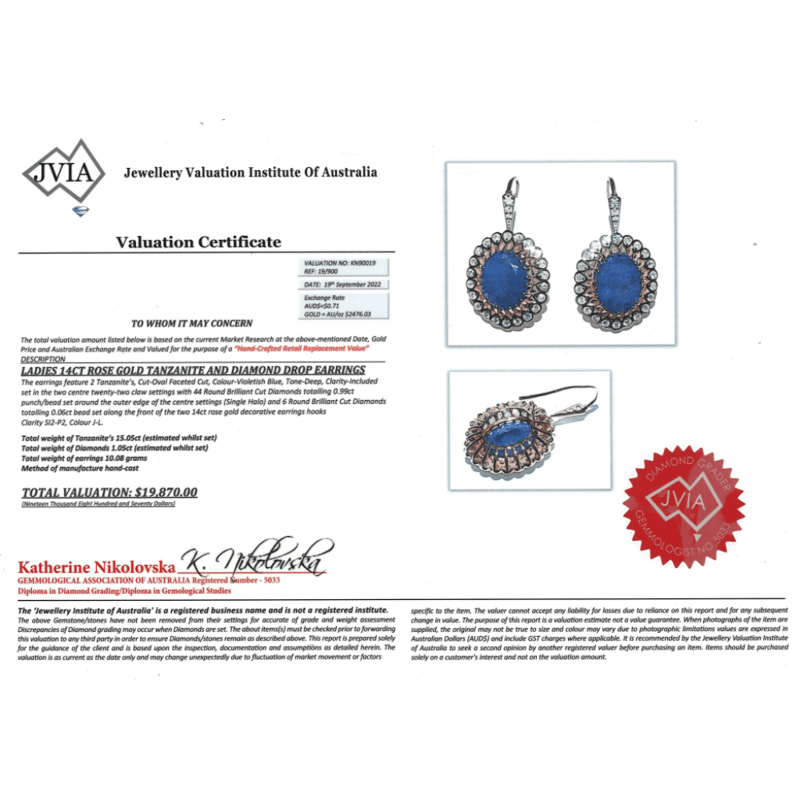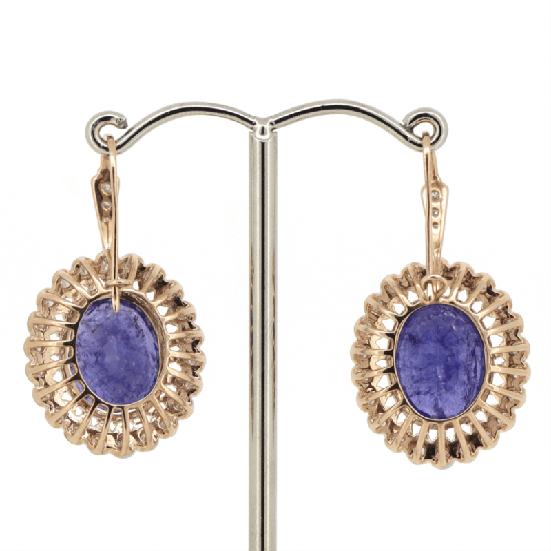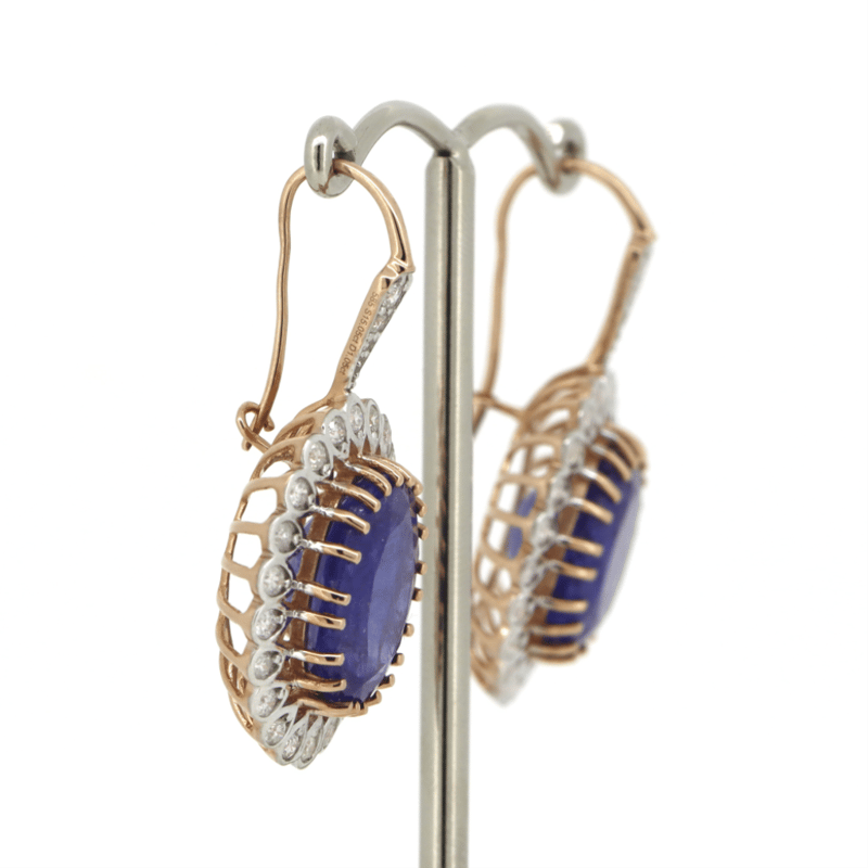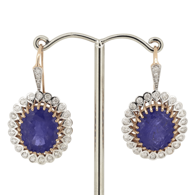 The Centre Features, 2 Faceted Cut, Deep Violetish-Blue, Tanzanites (15.05Ct Tsw, Included), Multi-Claw Set. Surrounding The Centres In Halos Are, 44 Round Brilliant Cut, Diamonds (0.99Ct Tdw, J-L Colour, Si2-P2 Clarity), Bead Set. Decorating The Hooks Are, 6 Round Brilliant Cut, Diamonds (0.06Ct Tdw, J-L Colour, Si2-P2 Clarity), Bead Set.