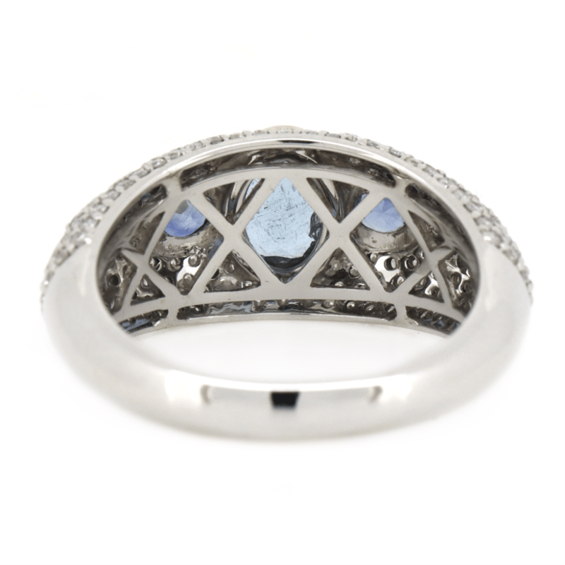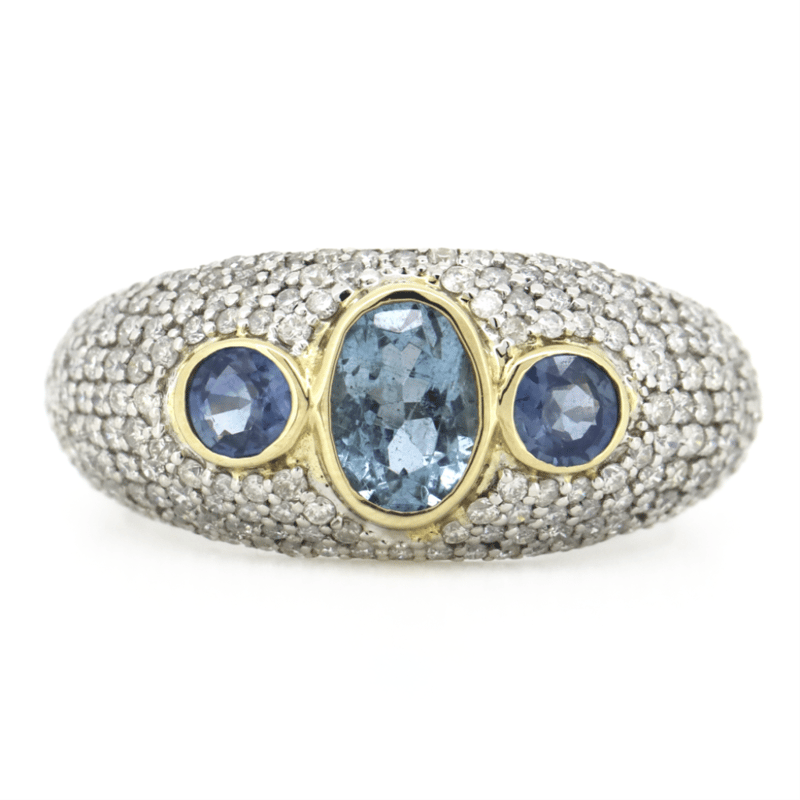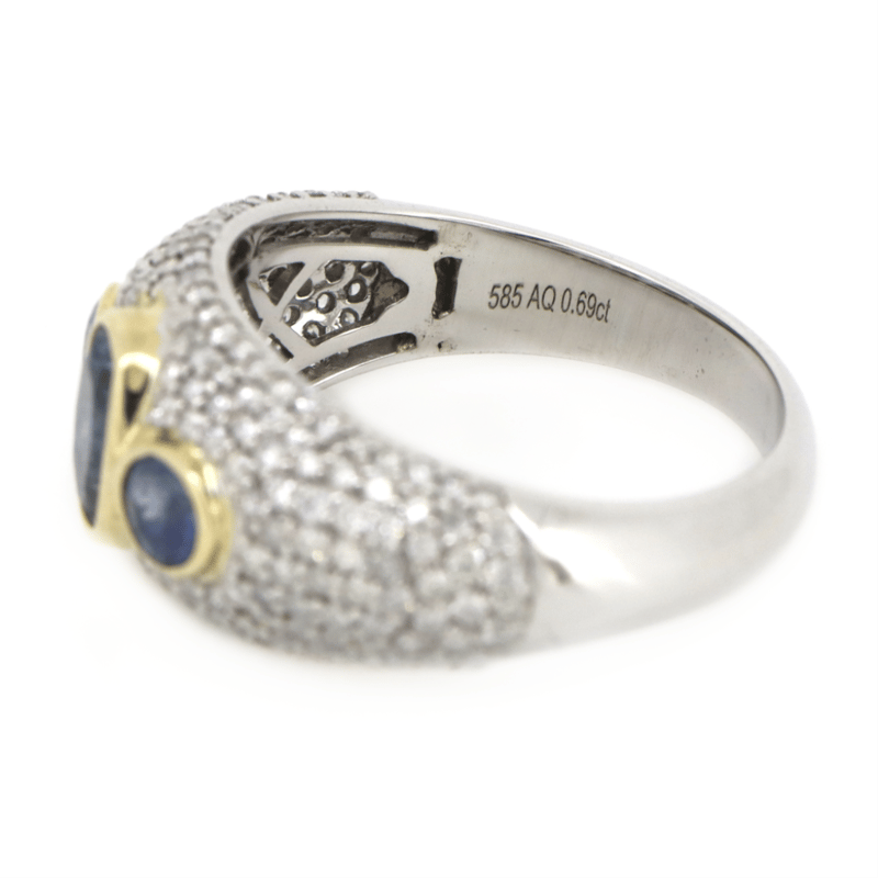 14K WHITE/YELLOW GOLD, SANTA MARIA BLUE AQUAMARINE AND BLUE SAPPHIRE, TRILOGY CLUSTER RING.
